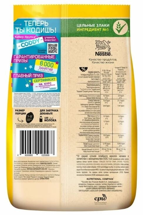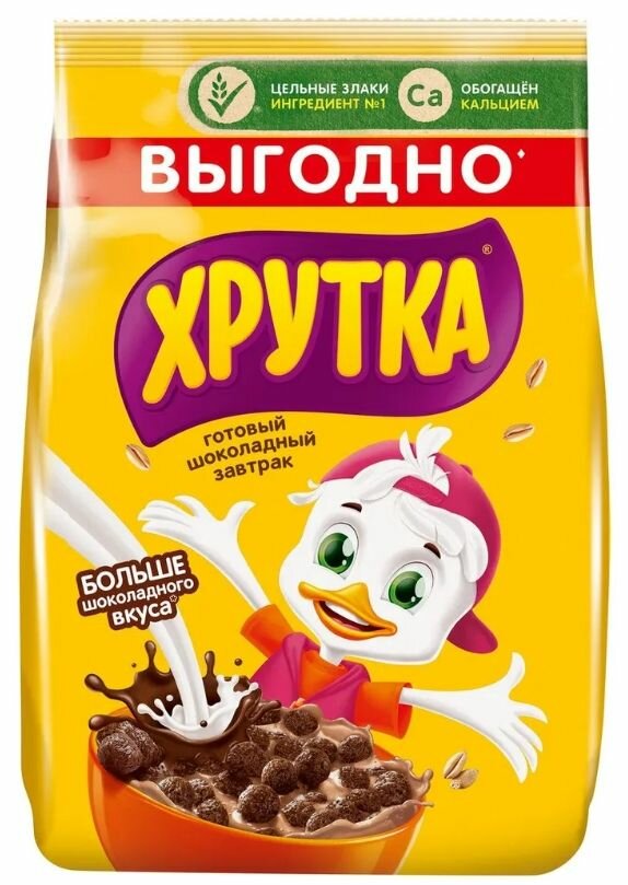 При этом экономичной упаковки Хрутка 650 гр хватит на всю семью и надолго. Утром готовый завтрак с шоколадными шариками подарит всем полезную энергию благодаря цельным злакам пшеницы и кукурузы, богатым клетчаткой. А кальций важен для поддержания здоровья костей и зубов.