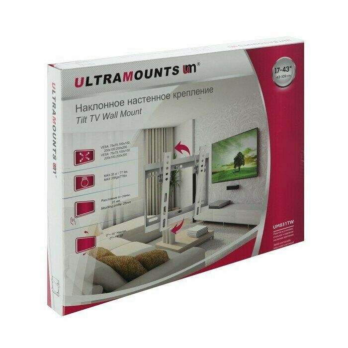 ULTRAMOUNTS - наклонный кронштейн, который предназначен для надежного крепления к стене LED, LCD и плазменных телевизоров с креплением VESA до 200x200 и максимальным весом 35 килограмм. Крепежная площадка обладает надёжным креплением - телевизор прочно зафиксирован на небольшом расстоянии от стены. Кронштейн выполнен из высококачественной стали. Весь необходимый крепеж, входящий в комплект поставки, гарантирует легкий и простой монтаж.