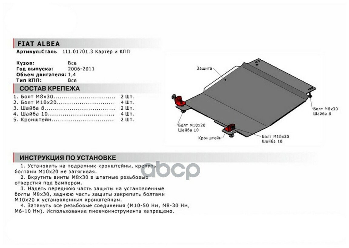 Защита картера и КПП Автоброня Fiat Albea картер, V - 1,4 2006-2011, сталь 2 мм., комплект крепежа,