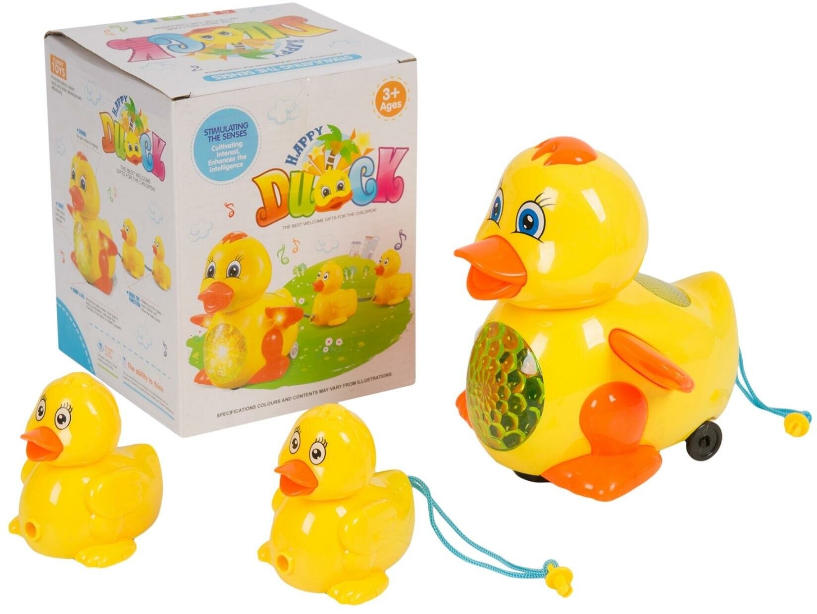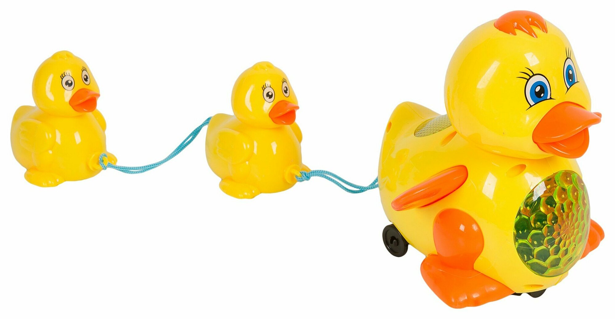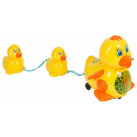Замечательная игрушка в виде уточки с утятами будет способствовать развитию ребенка за счет стимулирования зрительного и слухового восприятия. Уточка-мама издает веселые звуки, мерцает огоньками и пузиком освещает путь своим утятам. Для работы уточки необходимы 3 батарейки АА (не входят в комплект).