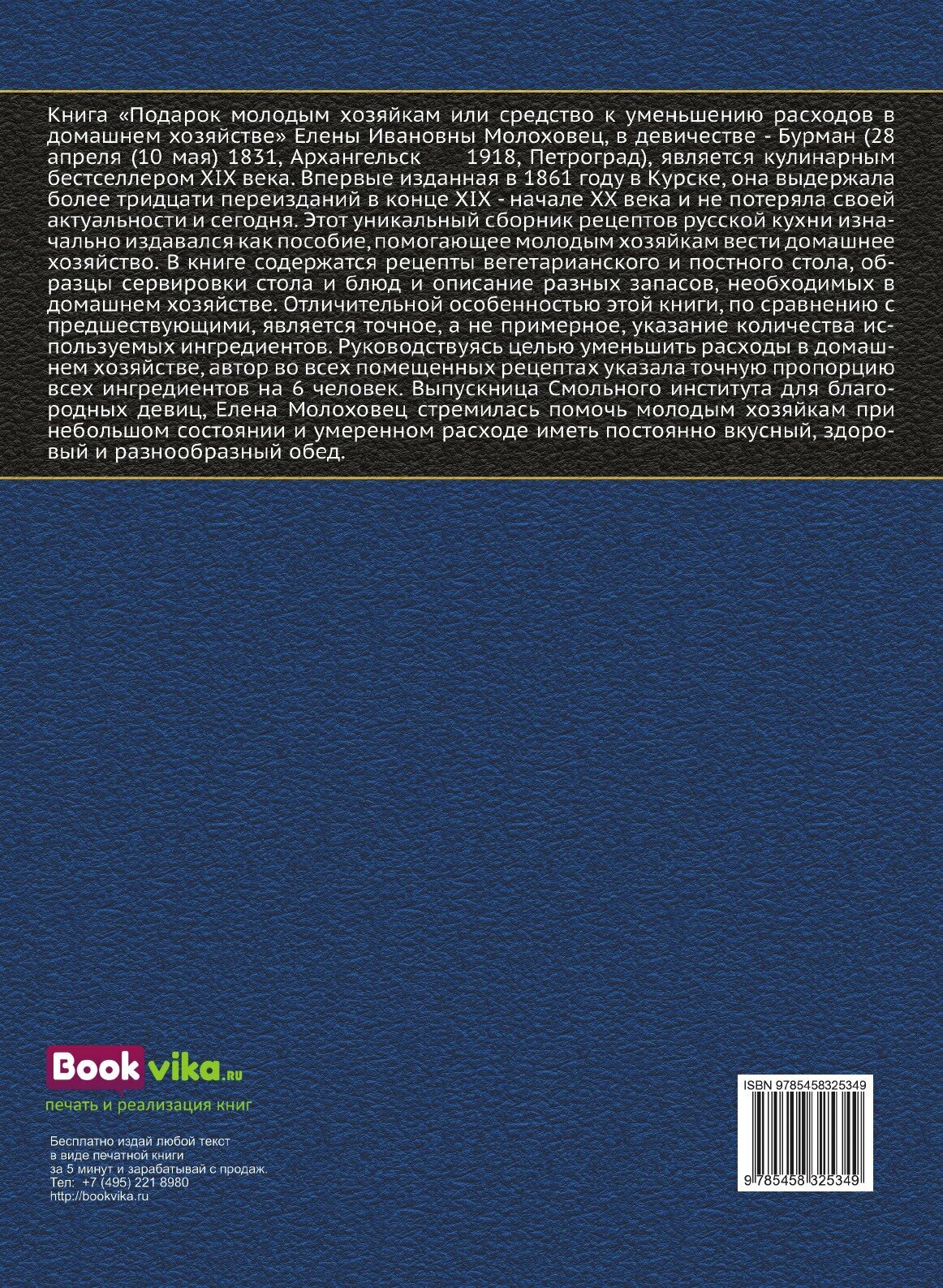 Книга «Подарок молодым хозяйкам или средство к уменьшению расходов в домашнем хозяйстве» Елены Ивановны Молоховец, в девичестве - Бурман (28 апреля (10 мая) 1831, Архангельск 1918, Петроград), является кулинарным бестселлером XIX века. Впервые изданная в 1861 году в Курске, она выдержала более тридцати переизданий в конце XIX - начале XX века и не потеряла своей актуальности и сегодня. Этот уникальный сборник рецептов русской кухни изначально издавался как пособие, помогающее молодым хозяйкам вести домашнее хозяйство. В книге содержатся рецепты вегетарианского и постного стола, образцы сервировки стола и блюд и описание разных запасов, необходимых в домашнем хозяйстве. Отличительной особенностью этой книги, по сравнению с предшествующими, является точное, а не примерное, указание количества используемых ингредиентов. Руководствуясь целью уменьшить расходы в домашнем хозяйстве, автор во всех помещенных рецептах указала точную пропорцию всех ингредиентов на 6 человек. Выпускница Смольного института для благородных девиц, Елена Молоховец стремилась помочь молодым хозяйкам при небольшом состоянии и умеренном расходе иметь постоянно вкусный, здоровый и разнообразный обед.