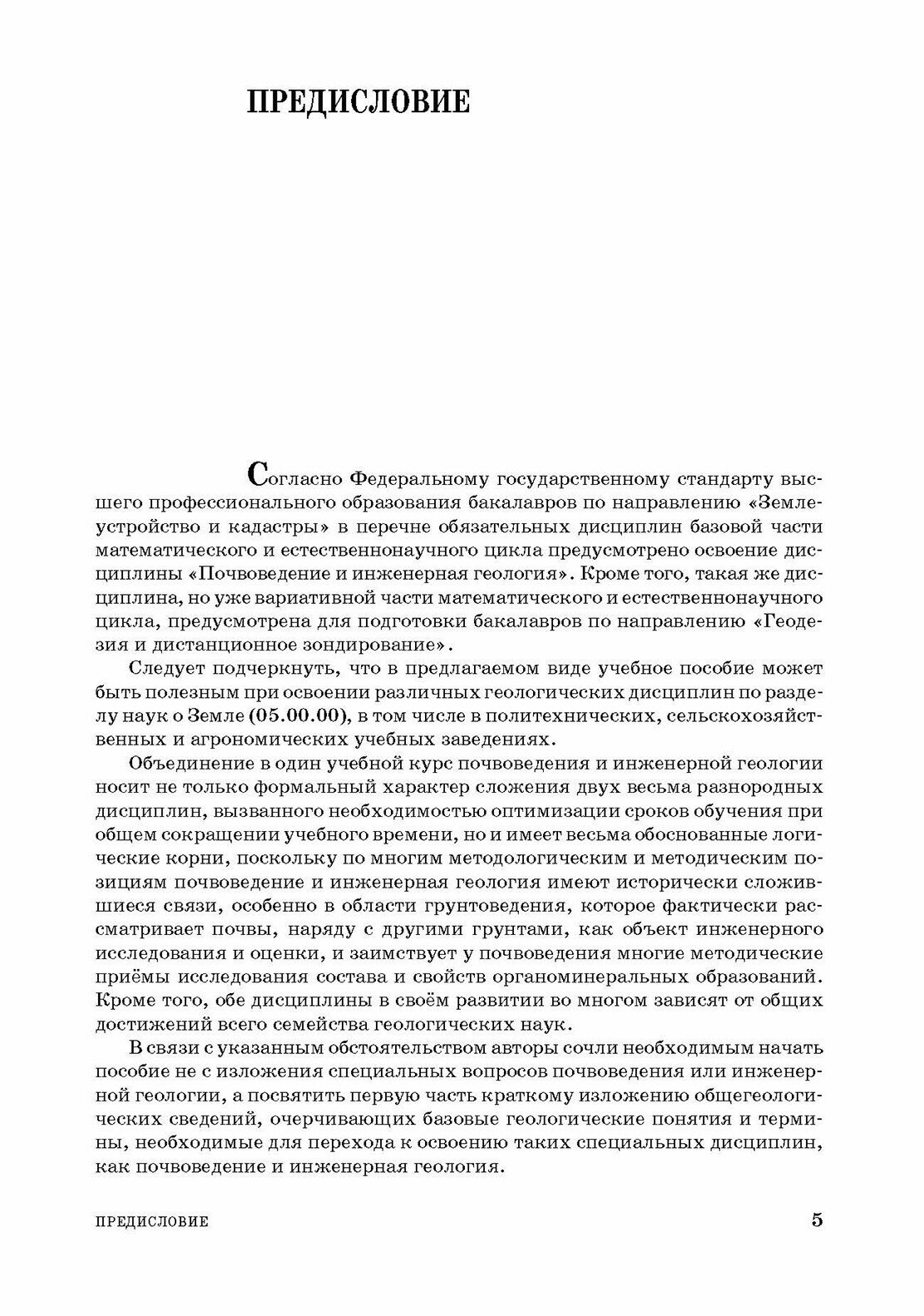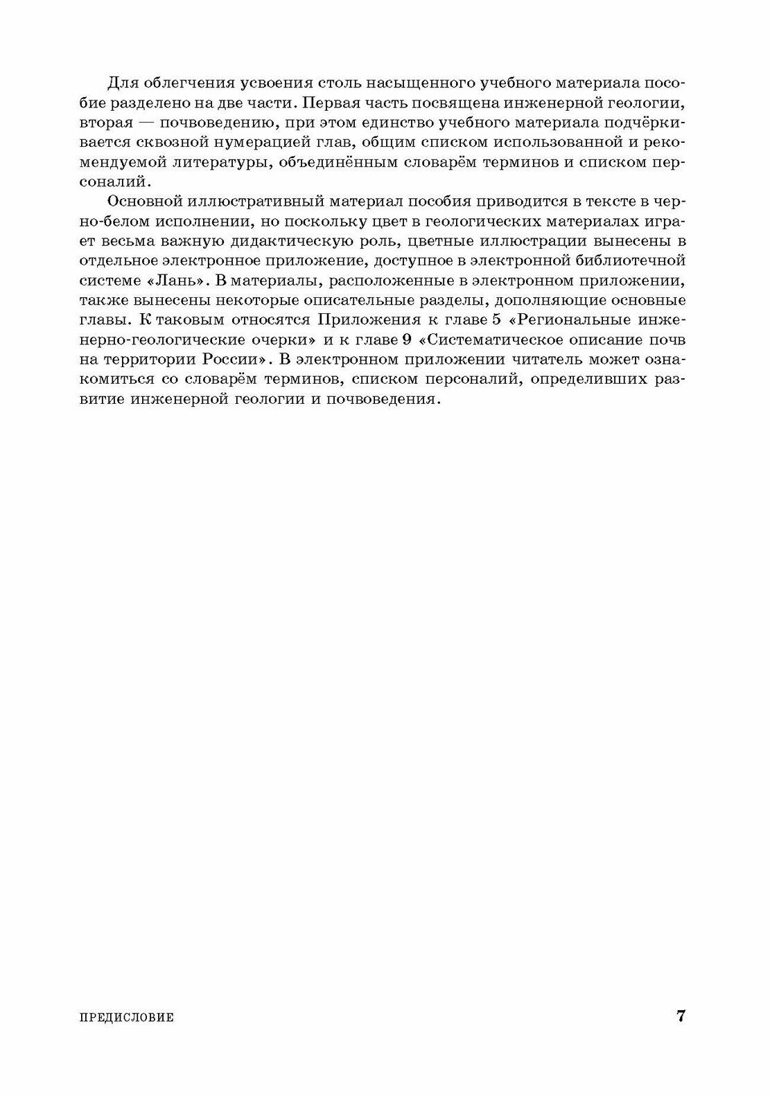 Даются начала геологических знаний в объёме сведений по общей и полевой геологии. Рассматриваются основные разделы инженерной геологии в составе грунтоведения, инженерной геодинамики, инженерных изысканий и региональной инженерной геологии. Обосновывается общий объект изучения грунтоведения и почвоведения - почвы, и рассматриваются основы генетического почвоведения и типизация почв на территории России. Приводится характеристика состава, состояния и свойств различных грунтов, включая почвы, как многофазных систем. Рассмотрены условия залегания и движения подземных вод и определена роль подземных вод при освоении территорий и строительстве различных зданий и сооружений. Формулируется понятие об инженерно-геологических условиях и рассматриваются закономерности их формирования по регионам страны. Приводится систематическое описание почв по различным регионам России. Подчеркивается неразрывная связь инженерной геологии и почвоведения с вопросами рационального использования и охраны природой среды.