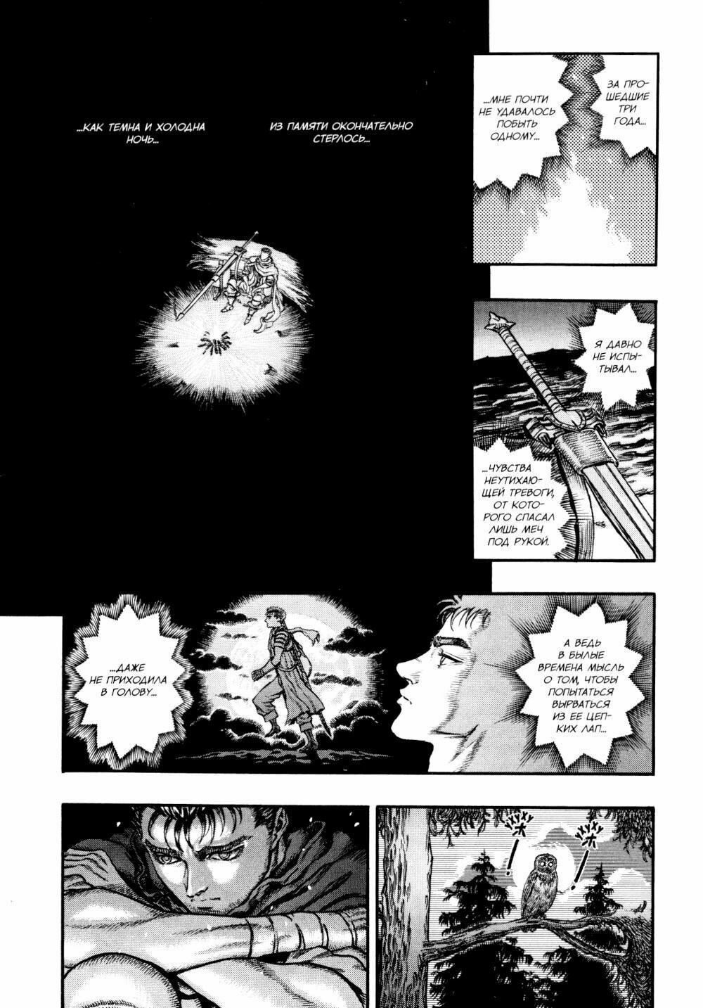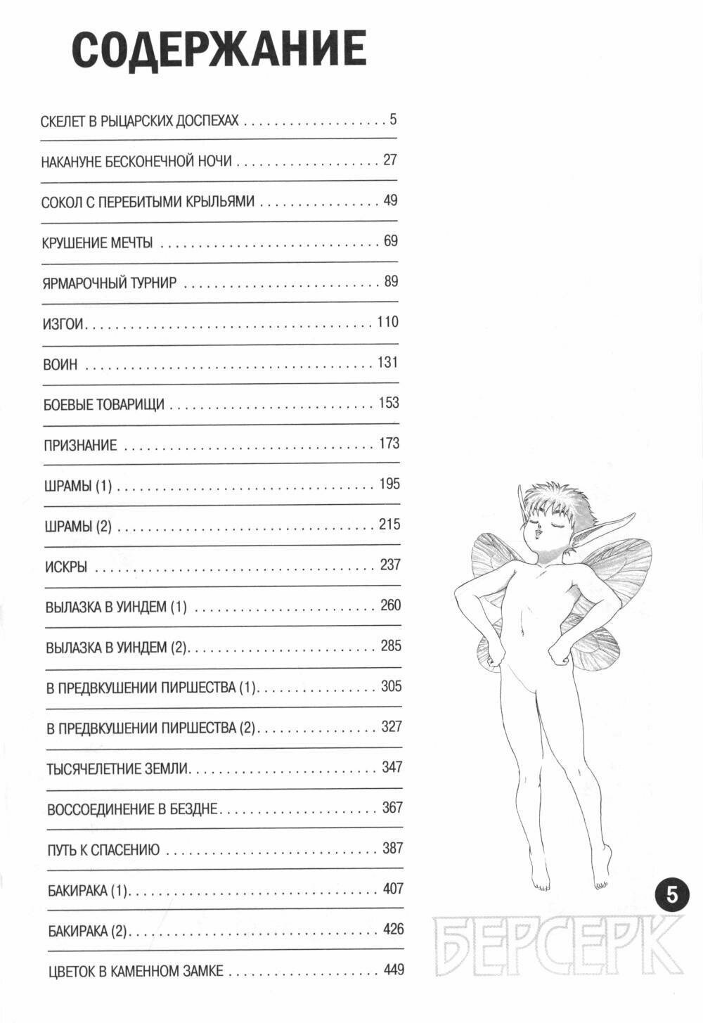 В книгу вошли 9-й и 10-й тома оригинальной манги, 22 главы: "Скелет в рыцарских доспехах", "Накануне бесконечной ночи", "Сокол с перебитыми крыльями", "Крушение мечты", "Ярмарочный турнир", "Изгои", "Воин", "Боевые товарищи", "Признание", "Шрамы" (1-2), "Искры", "Вылазка в Уиндем" (1-2), "В предвкушении пиршества" (1-2), "Тысячелетние земли", "Воссоединение в бездне", "Путь к спасению", "Бакирака" (1-2) "Цветок в каменном замке". Здесь продолжается арка "Золотой век".