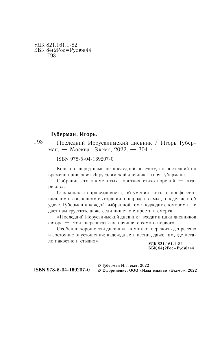 Последний Иерусалимский дневник (Губерман Игорь Миронович); ООО "Издательство "Эксмо", 2022