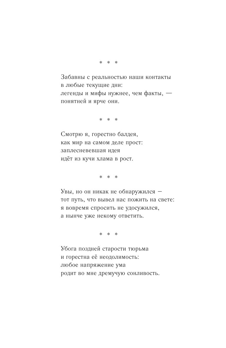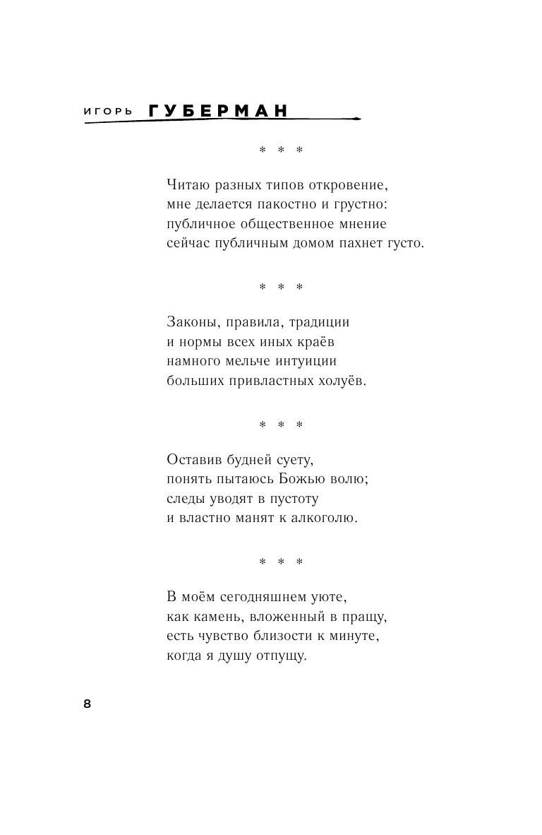 О законах и справедливости, об умении жить, в профессиональном и жизненном выгорании, о народе и семье, о надежде и об удаче. Губерман к каждой выбранной теме подходит с юмором и не дает нам грустить, даже если пишет о старости и смерти.