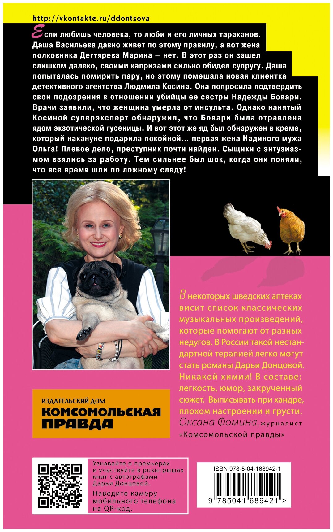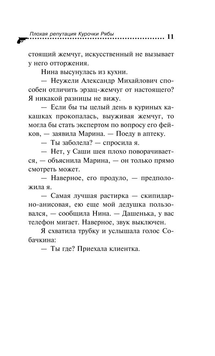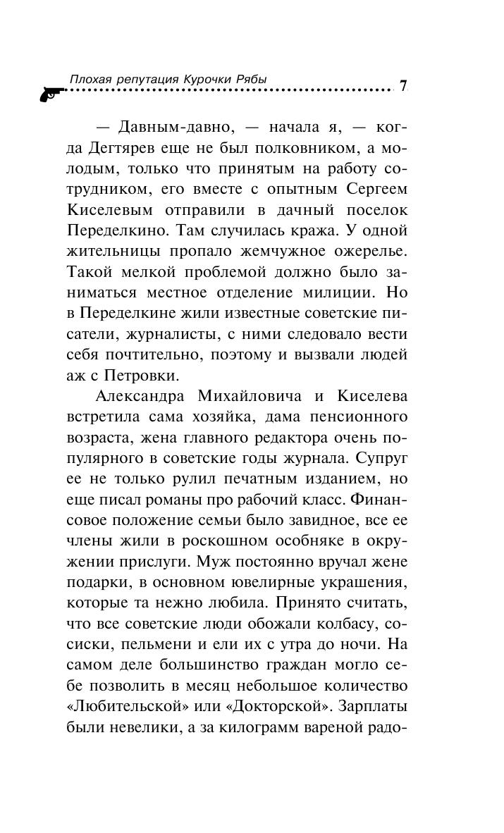 Люблю серию про приключения Даши Васильевой и компании. В конфликте Марины и полковника Дегтярева даже сложно сказать, кому больше сочувствую. С одной стороны, мужчине сложно вникать в особенности женских эмоций, а с другой, он как-то быстро привык, что его обслуживают, а сам так и не понял, что его жене приятно, а что нет. Вся эта история о сложных семейных отношениях, которые легко могут превратиться в змеиный клубок. Убитая Надя, которую прозвали «Курочка Ряба», симпатии не вызывает, и это мне в детективе нравится, очень грустно, когда погибает персонаж положительный. Но какой бы ни была убитая, до правды докопаться надо. В истории нет ни одной лишней детали, расследование дает противоречивую информацию, вместе с Дашей ломаешь голову, как можно свести воедино прямо противоположные факты. Причем в конце, когда все открывается, понимаешь, какие эпизоды на это намекали. Очень интересный детектив о том, что жадность и подлость никогда не приведут к счастью.