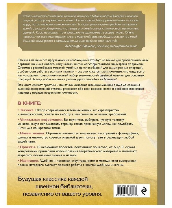 Почти в любом доме есть швейная машина, ножная, ручная, электрическая, электронная. Использовать все ее возможности, научиться выполнять все швейные операции, настроить машину самостоятельно, правильно выбрать строчку, исправить мелкие неисправности, разобраться в огромном разнообразии аксессуаров, способных существенно облегчить работу, научит эта понятная и богато иллюстрированная книга!