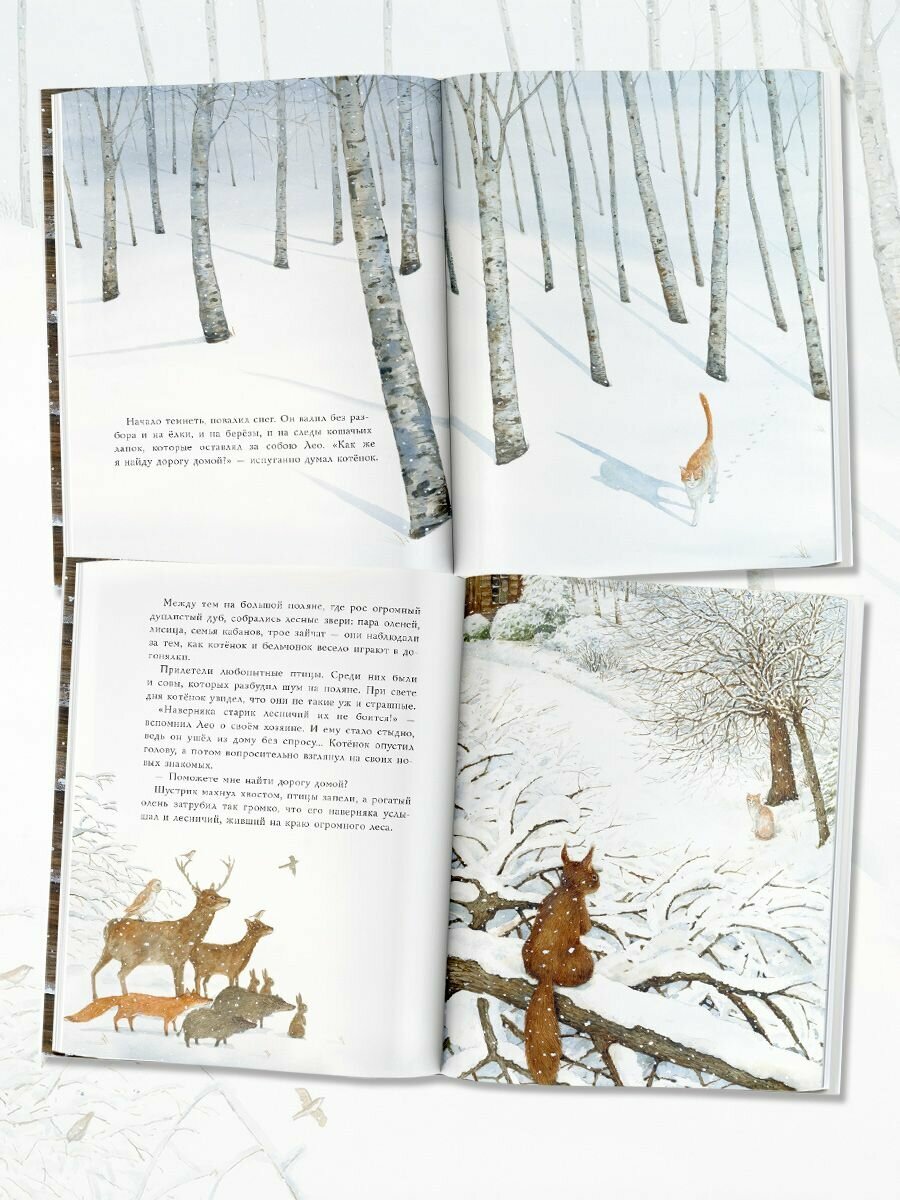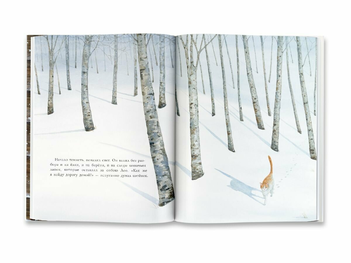 Если за окном бесшумно падает пушистый снег (и даже если нет), и медленно наступает вечер, самое время зажечь тёплые гирлянды в комнате, уютно устроиться под одним пледом вместе с ребёнком и неспешно прочитать добрую историю про котёнка Лео, живущего со своим хозяином рядом с лесом.
