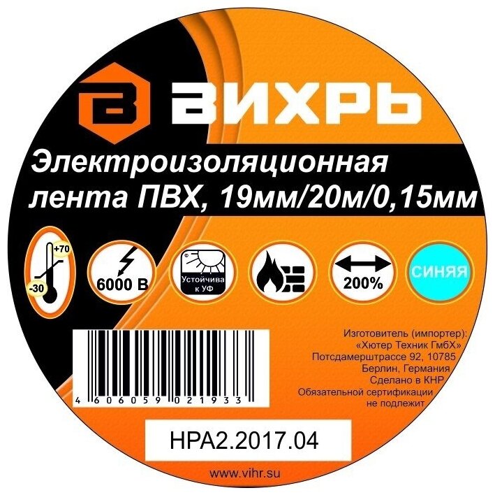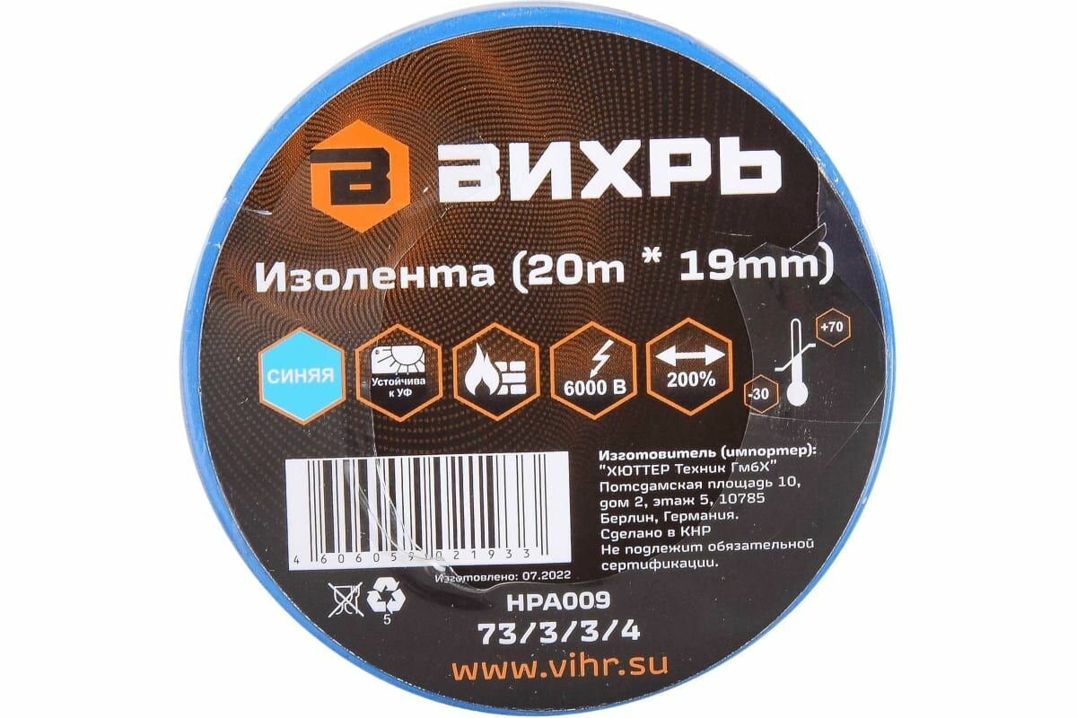Изоляционная лента Вихрь ПВХ синяя 20 м * 19 мм используется для проведения всех видов электромонтажных работ: электрической изоляции проводников, сращивания и жгутирования, защиты от механических повреждений, цветовой маркировки. Изолента изготовлена на основе пленки из поливинилхлоридного изоляционного пластиката. Специальные добавки, используемые при производстве данного материала, повышают эластичные свойства ленты, увеличивают ее долговечность и обеспечивают устойчивость к горению.Преимущества Выдерживает напряжение пробоя - 6000 В Обладает высокими клеевыми свойствами Эластичная и прочная, удлинение при разрыве - от 170 до 200% Устойчива к ультрафиолетовым лучам Не поддерживает горение Диапазон рабочих температур - от -30°С до +70°С