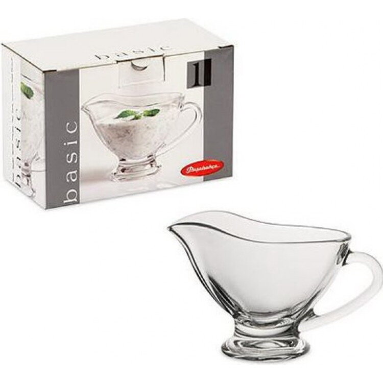 Стеклянный соусник с ручкой и носиком бренда Pasabahce.