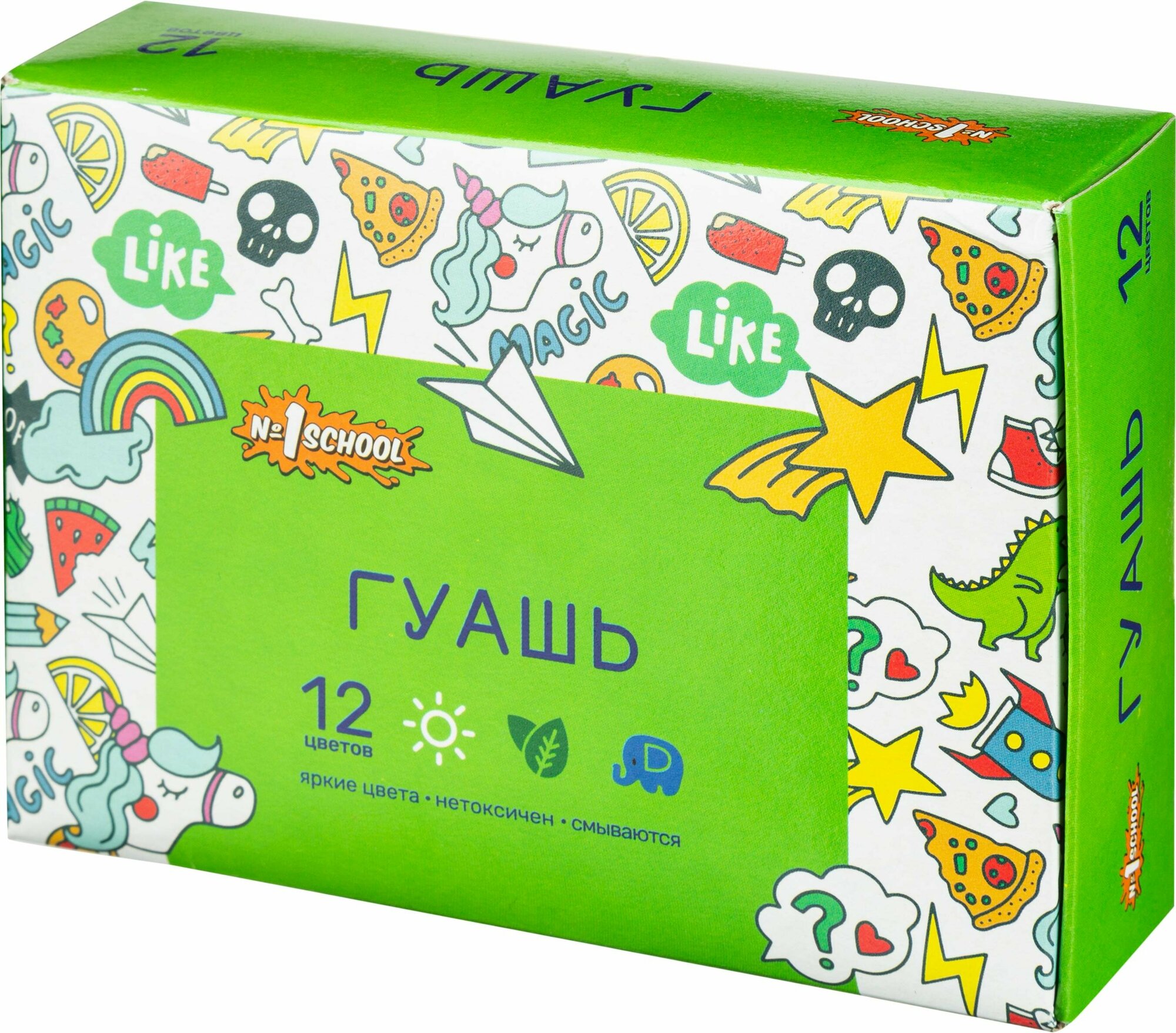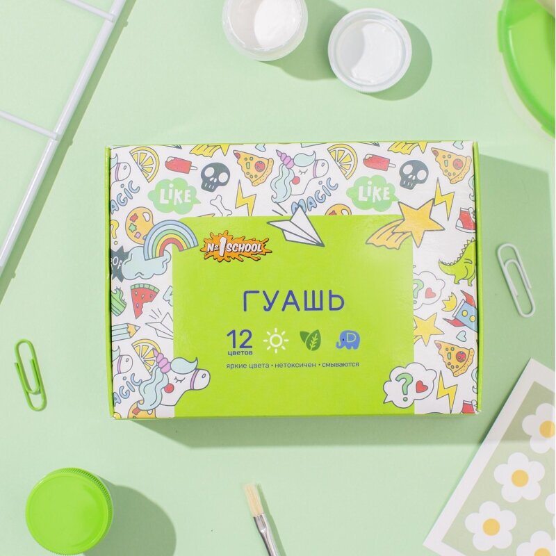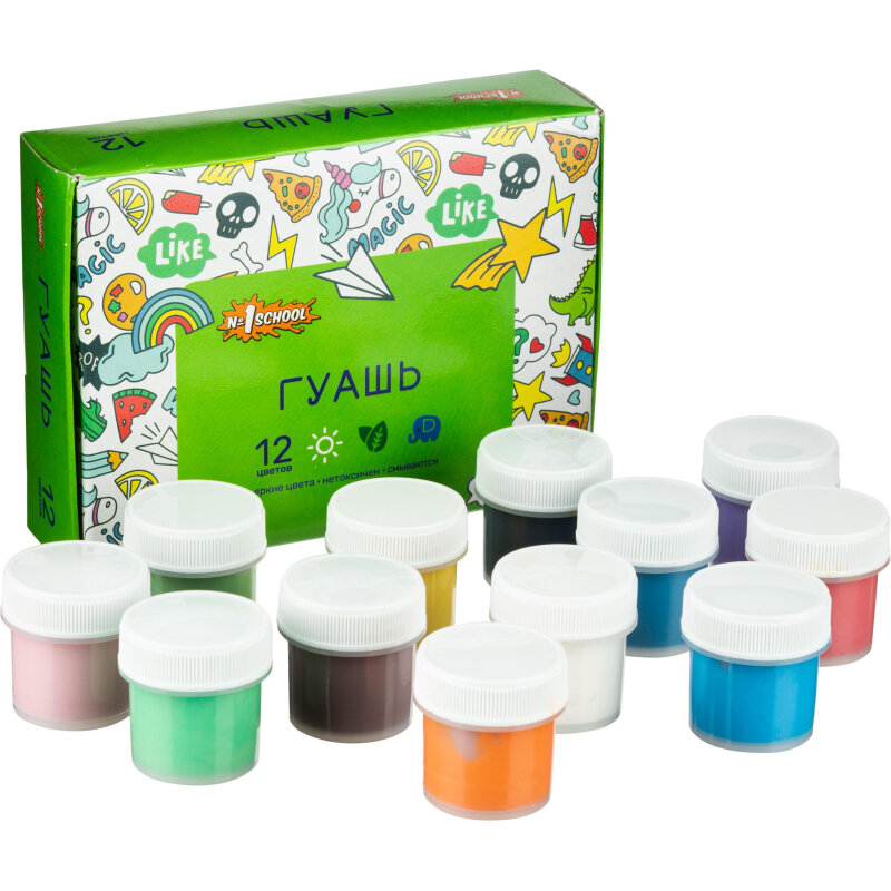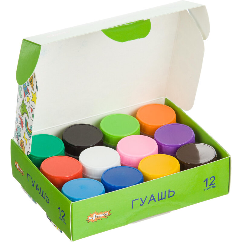 Гуашь № 1 School «Отличник» предназначена для детского творчества, при необходимости разбавляется водой, безвредна, быстро высыхает, легко смывается с рук и одежды. Краски изготовлены на основе натуральных компонентов и высококачественных пигментов. Обладают хорошей кроющей способностью и чистотой цвета. Гуашь находится в пластиковых герметичных баночках с завинчивающейся крышкой.В набор входит 12 цветов: черный, охра, зеленый, красный, оранжевый, желтый, голубой, белый, синий, коричневый, светло-зеленый , розовый.Краски упакованы в цветную картонную коробку, размер упаковки (ДxШxВ): 150×115×32 мм. Объем одной баночки — 10 мл. Поставляется без кисти.