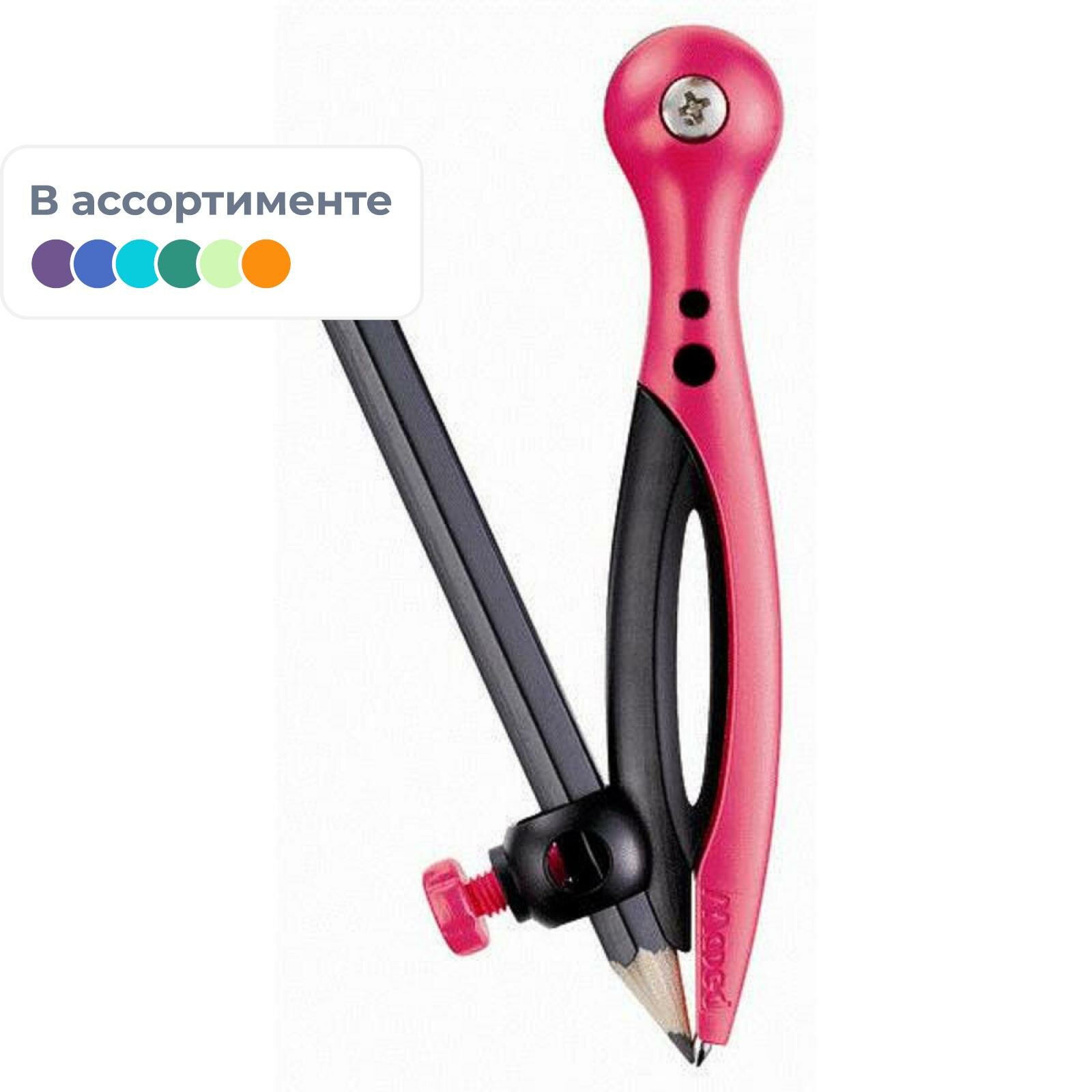 Циркуль с универсальным держателем. Материал циркуля: пластик со стекловолоконным усилением. Безопасная игла. В комплекте карандаш.