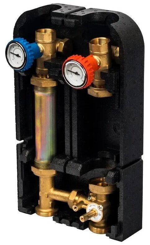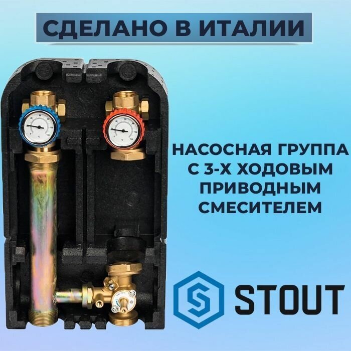 Stout SDG-0003-002501- насосная группа быстрого монтажа, которая предназначена для обвязки котлов и обеспечивает принудительную циркуляцию теплоносителя. Насосная группа с термостатическим смесительным клапаном, за счет которого осуществляется поддержанием постоянной температуры (точки фиксации) состоит из двух запорных шаровых кранов и одного обратного клапана, двух термометров подающей и обратной линии, смесительного клапана под привод, байпаса и блочной теплоизоляции.