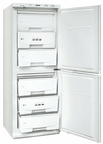 Морозильник Pozis прекрасно подойдет любителям домашних заготовок. При общем объеме 260 л, объем морозильной камеры составляет 204 л. Две камеры, в каждой из которых находится по три выдвижных ящика для хранения, предоставляют возможность сортировки замораживаемого. Нужные продукты можно быстро найти и извлечь при необходимости. В верхней части морозильника расположен поддон, позволяющий хранить аккумуляторы холода, а также быстро замораживать продукты небольшого объема.