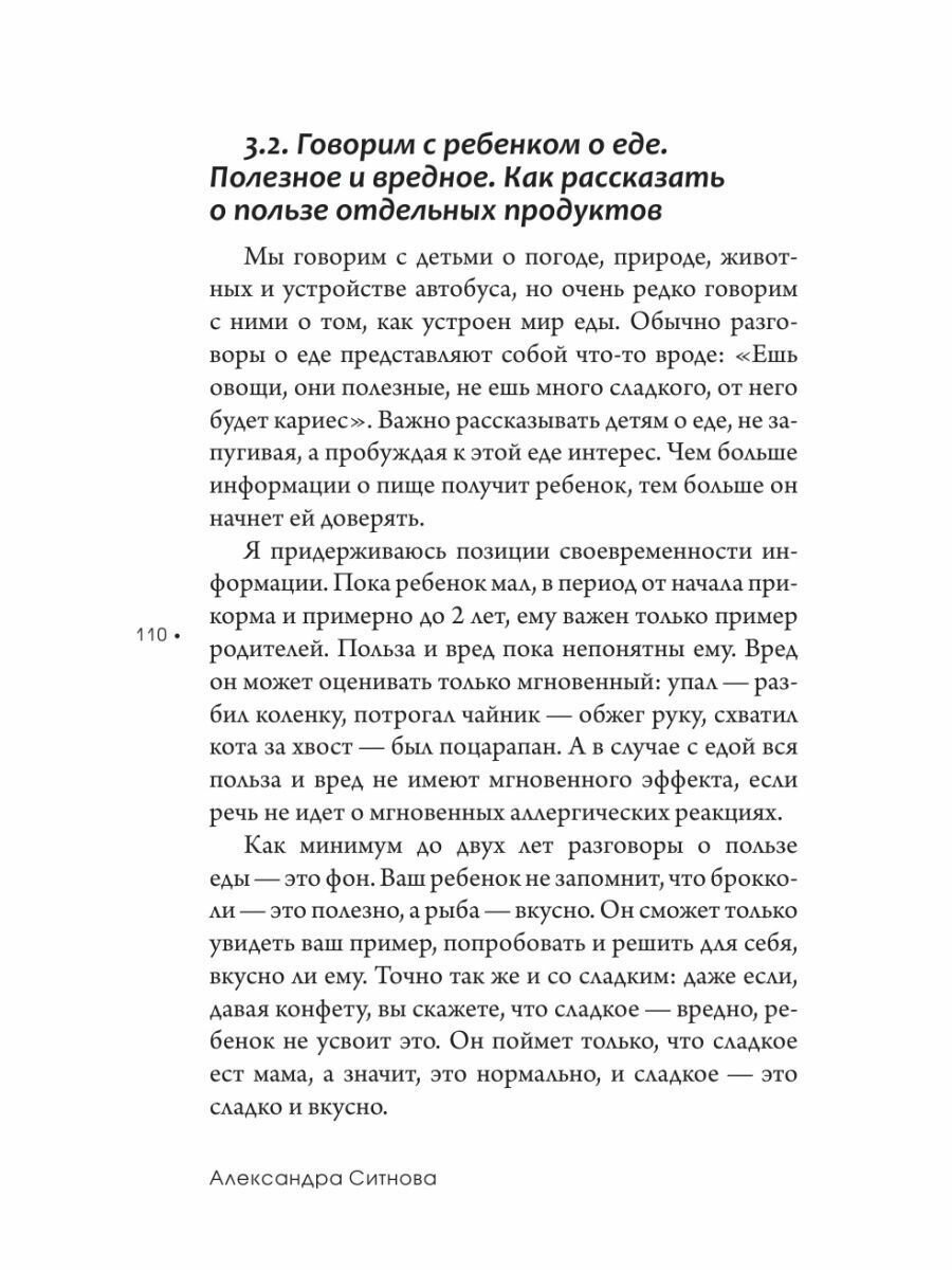 Книга написана простым понятным языком. Каждый раздел содержит главу для совместного чтения с ребёнком про пищеварение, аппетит, полезную/вредную еду. Отдельно хочется отметить главу с быстрыми и лёгкими рецептами без диковинных ингредиентов вроде правой пятки девственной курицы :) -