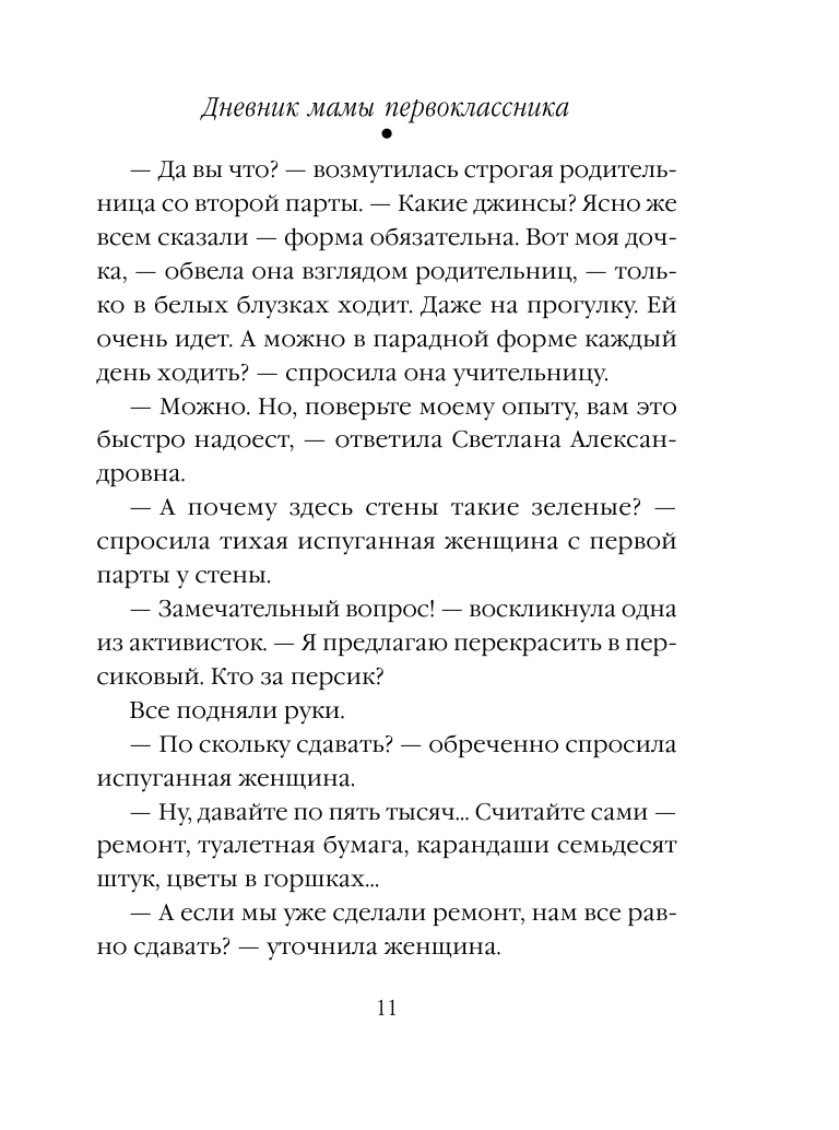 Книга порадовала, что уж говорить. Местами было очень смешно, местами грустно, сразу вспомнила как мой ребёнок пошёл в первый класс и как действительно похожи многие ситуации. Книгу однозначно советую почитать, конечно сейчас многое в школьном процессе изменилось но всё равно очень интересно. Книжечка маленькая, листы тоненькие, шрифт довольно крупный. Обязательно куплю Второй раз в первый класс))