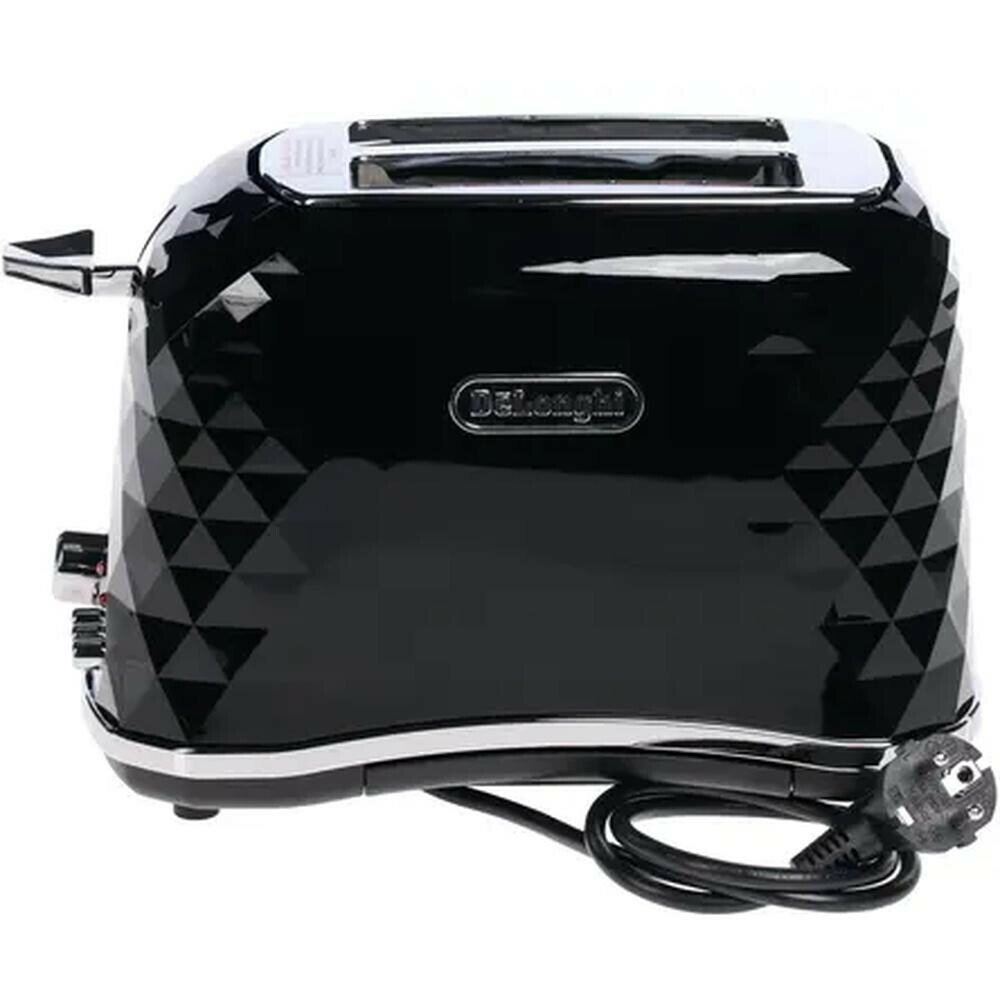 Тостер DeLonghi Brillante в стильном граненом корпусе из темного пластика. Решетка для подогрева булочек и круассанов послужит дополнительным плюсом во время приготовления завтрака. В тостере есть функция «Экстра-подъем» для упрощения извлечения маленьких кусочков хлеба, а также прогрессивный электронный контроль прожаривания тостов. Съемный поддон для крошек служит для удобства очистки прибора после использования.