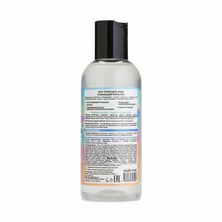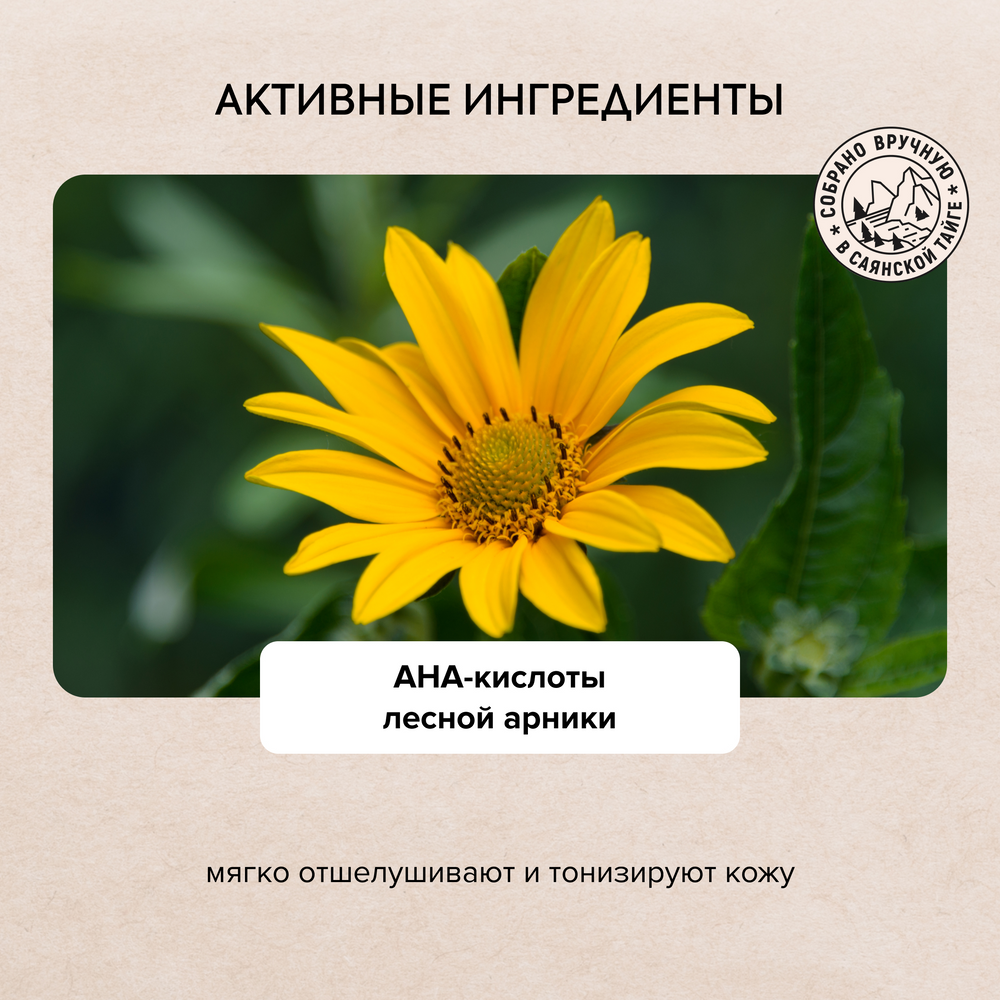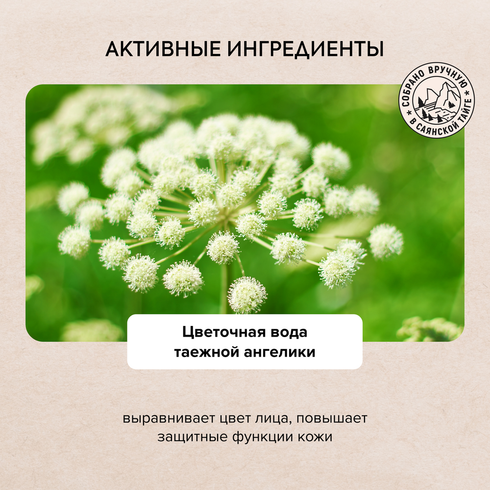 Таежная ангелика содержит эфирные масла, жирные кислоты и важнейший для молодости кожи витамин В12. Цветочная вода таежной ангелики выравнивает цвет лица, повышает ее защитные функции. АНА кислоты лесной арники мягко отшелушивают и тонизируют. Комплекс ACTIVE C+ - это формула витамина C, дополненная биофлавоноидами. Оказывает мощное антиоксидантное действие и увеличивает синтез коллагена в клетках кожи.