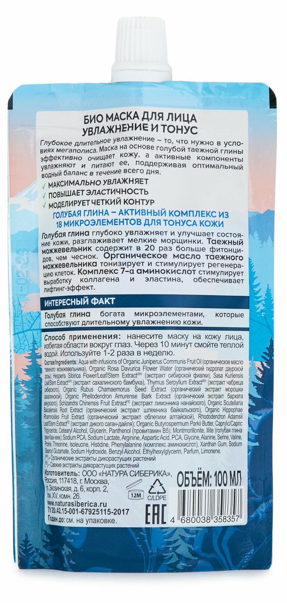 | Состав | Aqua with infusions of Organic Juniperus Communis Fruit Oil (органическое масло таежного можжевельника); Organic Rosa Davurica Flower Water (органический гидролат даурской розы); Hesperis Sibirica Flower/Leaf/Stem ExtractWH (экстракт сибирской фиалки); Sasa Kurilensis Leaf/Stem ExtractWH (экстракт сахалинского бамбука); Thymus Serpyllum ExtractWH (экстракт чабреца сибирского); Rubus Chamaemorus Seed Extract (органический экстракт морошки сахалинской); Organic Phellodendron Amurense Bark Extract (органический экстракт бархата амруского); Schizandra Chinensis Fruit ExtractFE (экстракт лимонника нанайского); Organic Scutellaria Baicalensis Root Extract (органический экстракт шлемника байкальского); Organic Hippophae Rhamnoides Fruit Extract (органический экстракт облепихи алтайской); Rhododendron Adamsii Leaf/Stem ExtractFE (экстракт дикого саган-дайля); Organic Butyrospermum Parkii Butter; Caprylic/Capric Triglyceride; Cetearyl Alcohol; Glycerin; Panthenol (провитамин В5); Montmorillonite; Illite (голубая глина реки Каа-хем); Sodium PCA; Sodium Lactate; Arginine; Aspartic Acid; PCA; Glycine; Alanine; Serine; Valine; Proline; Threonine; Isoleucine; Histidine; Phenylalanine (комплекс аминокислот); Xanthan Gum; Sodium Stearoyl Glutamate; Sodium Hydroxide; Benzyl Alcohol; Ethylhexylglycerin; Parfum; Limonene. (WH)- Органические экстракты дикорастущих растений. (FE) – Свежие экстракты дикорастущих растений |