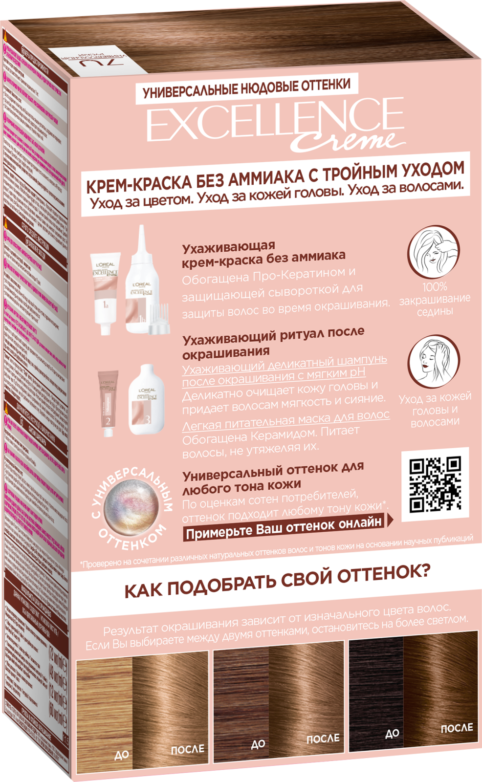 Экселанс Универсальные нюдовые оттенки это первая крем-краска без аммиака, которая на 100% закрашивает седину и обеспечивает тройной уход: уход за цветом, уход за кожей головы, уход за волосами.