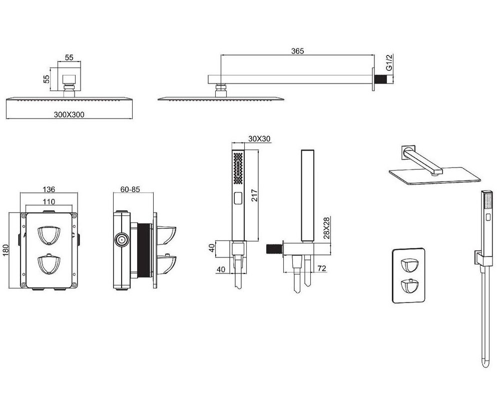 | Оснащение | Душевая лейка / Шланг для душа / Держатель душа / Кронштейн для верхнего душа / Шланговое подключение / Скрытая монтажная часть / Верхний душ / Смеситель |