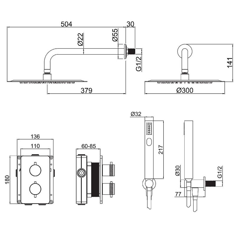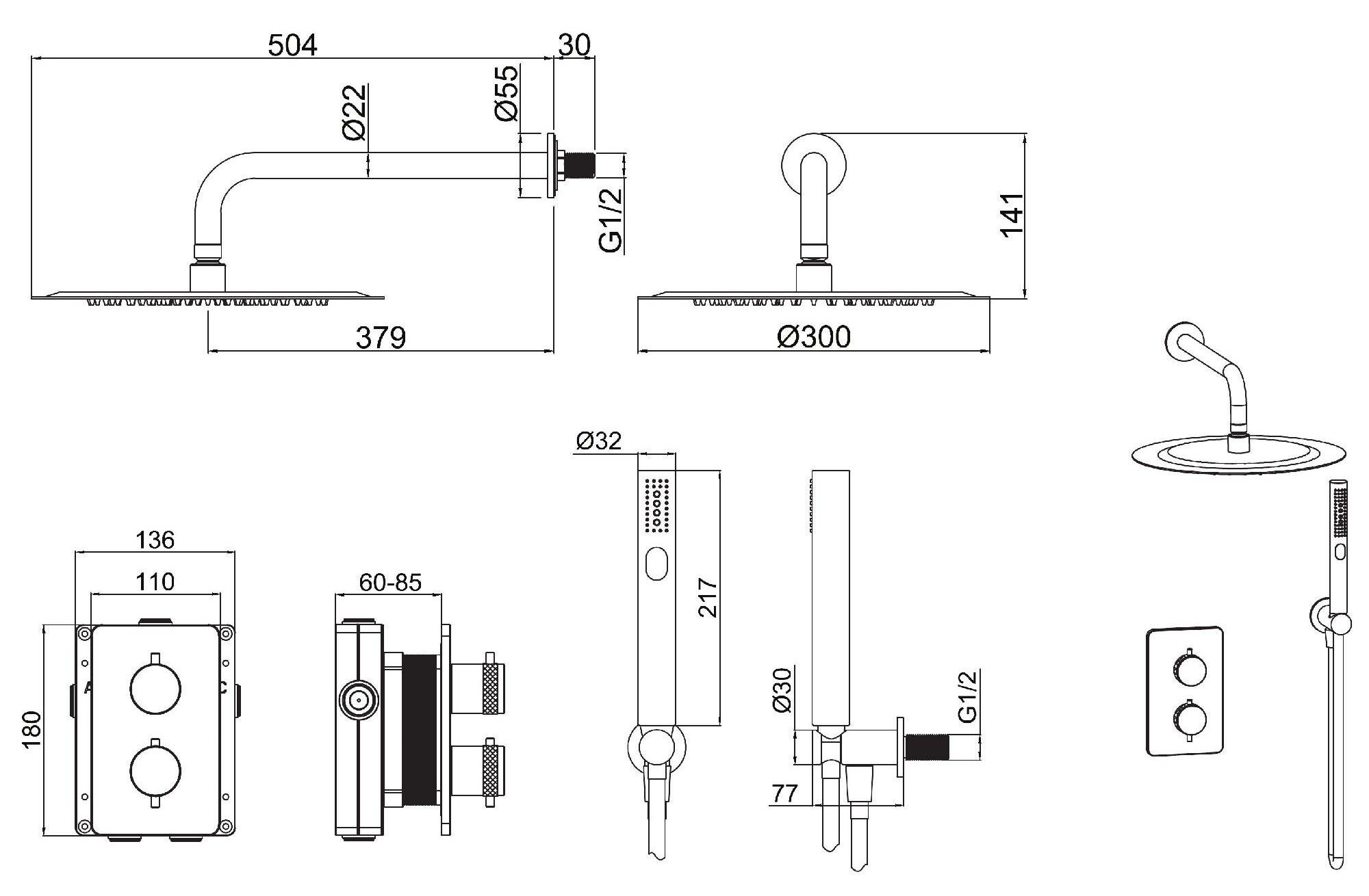 | Оснащение | Душевая лейка / Шланг для душа / Держатель душа / Кронштейн для верхнего душа / Шланговое подключение / Скрытая монтажная часть / Верхний душ / Смеситель |