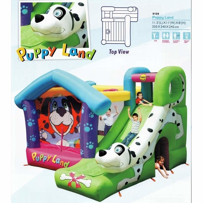 Эти два больших щенка порадуют маленьких любителей животных. Тем более, что благодаря им можно устроить такую веселую и увлекательную игру. Домик-батут и горка с защитной сеткой станут для ваших детей настоящим аттракционом.