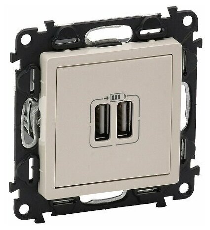USB-розетка для зарядки и питания различных мобильных устройств. Данная модель имеет два выхода. Соответствует директиве EEC о стандартах зарядки для мобильных устройств и унификации зарядных устройств для мобильных телефонов. Устанавливается в коробку скрытого монтажа глубиной не менее 40 мм.