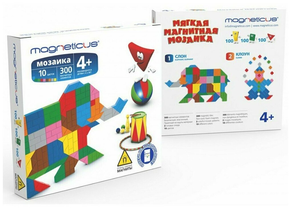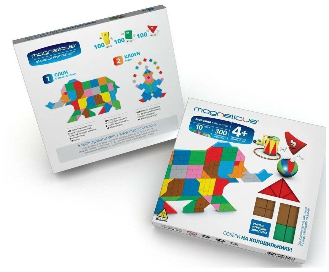 Мягкая магнитная мозаика Цирк -это набор, состоящий из геометрических фигур разных цветов и форм и листовки с вариантами сборки картин. Миди-мозаику можно собирать на любой металлической поверхности, поэтому ее удобно брать с собой в гости или короткие поездки. Она отлично сочетается с другими наборами Magneticus, имеющими металлическое игровое поле.Мозаика способствует развитию воображения, мелкой моторики, внимательности, а так же воспитывает в ребенке усидчивость.Состав набора: 300 мягких элементов из ЭВА 10 цветов с магнитным винилом (безопасный, эластичный, приятный на ощупь материал), 2 готовых этюда на коробке (Слон, Клоун).Форма и количество элементов: 100 прямоугольных элементов, 100 квадратных элементов, 100 треугольных элементов размером 1-2 см.Материал: полимерный материал (EVA) с магнитным слоем.Товар соответствует требованиям безопасности продукции.Возраст: от 4-х лет.