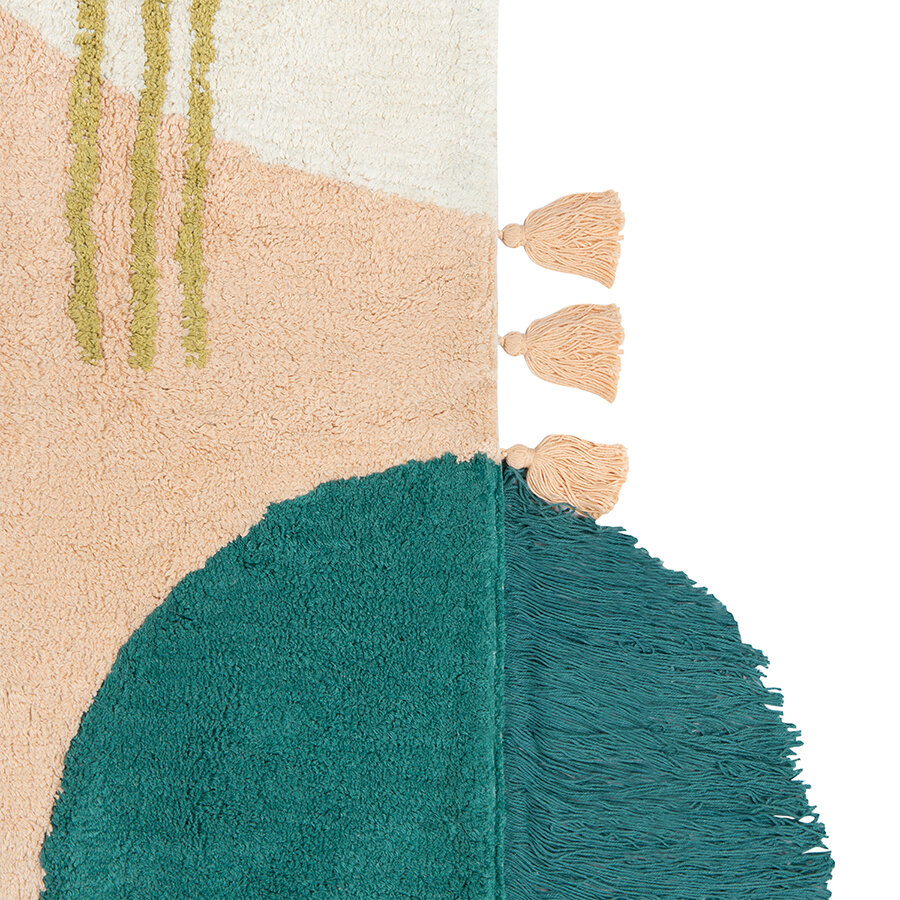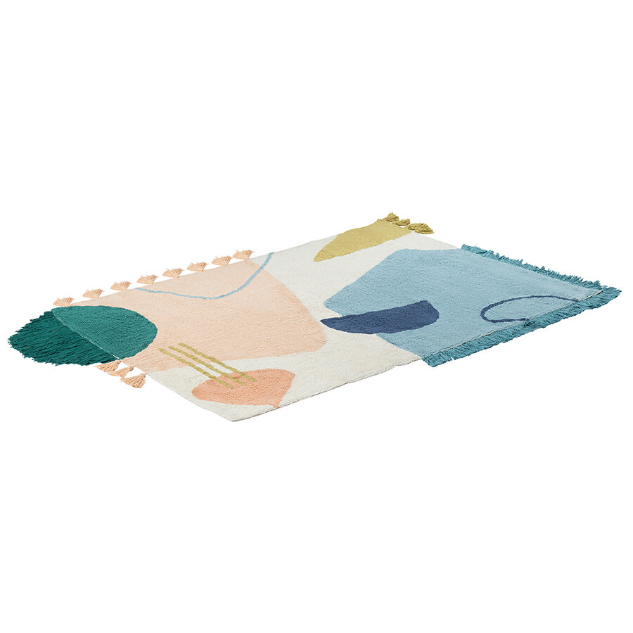Ковер из хлопка с геометрическим принтом, бахромой и кисточками из коллекции Ethnic органично впишется в любой интерьер: от минимализма и фьюжн, до скандинавского и бохо. Оригинальное изделие из высококачественного и прочного хлопка станет ярким акцентом в детской и другой комнате. На ковре органично сочетаются различные фактуры и объемный декор. В интерьере можно дополнить подушками в том же стиле. Ковер представлен в нескольких размерах.
