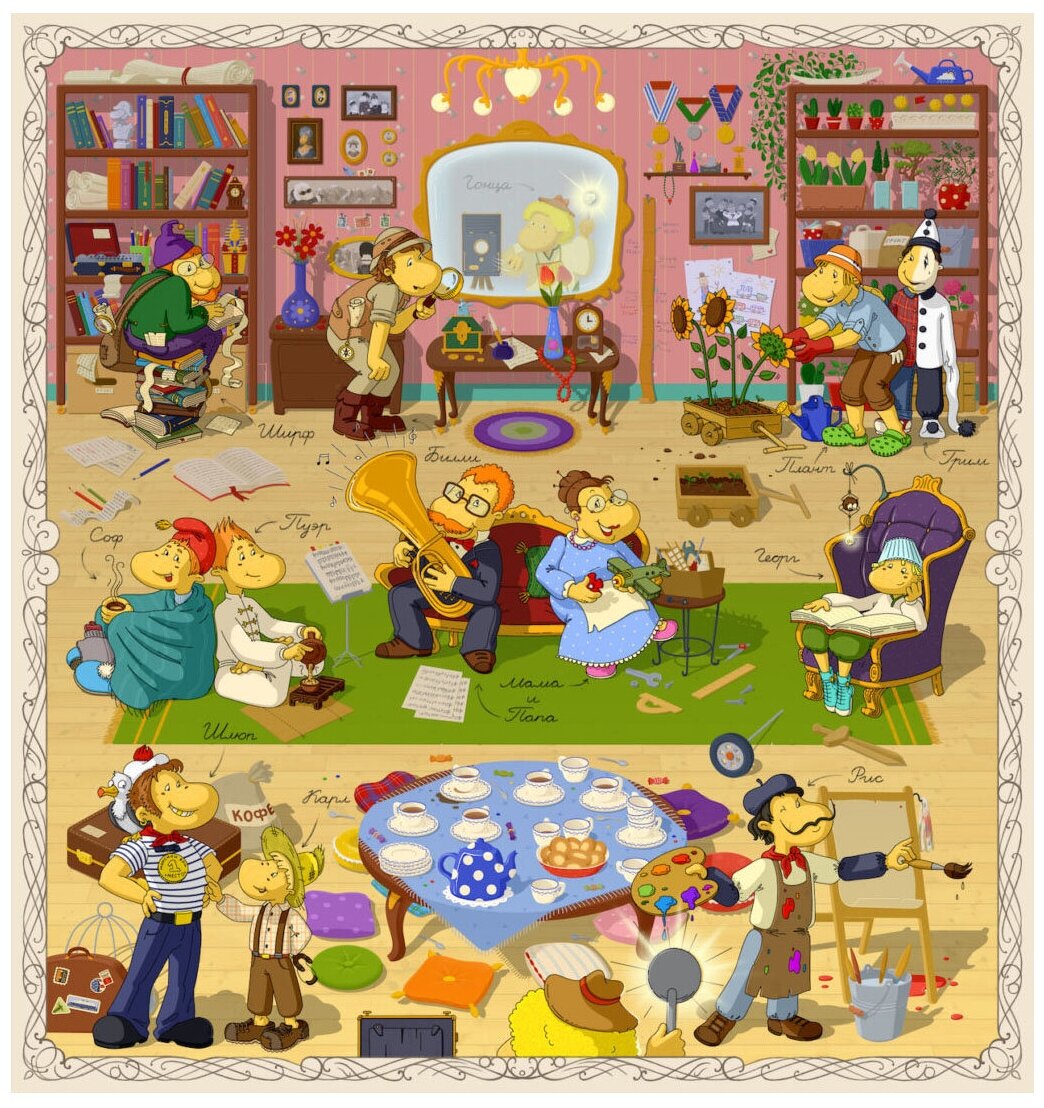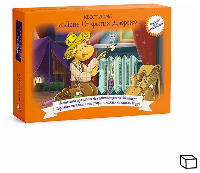 Kotikiteam Квест День открытых дверей 7 – 10 лет Мы знаем, как сделать детский праздник незабываемым: устройте увлекательный квест у себя дома или на даче! Всё, что нужно, уже в коробке – не требуется аниматор и дополнительной реквизит. Время на подготовку: 10–15 минут. Длительность игры: 45 минут – 1,5 часа. Участники: 1–8 человек. У игры есть две версии: для 7–9 лет и 10–14 лет. В младшей версии немного короче тексты и даны более подробные подсказки. Если у вас дети разного возраста, мы рекомендуем брать версию для старших, так как читать открытки будут они. Обязательное условие: хотя бы один из игроков должен уметь читать. Для проведения игры в доме должны быть: кровать с одеялом, шкаф с чайными принадлежностями или заварочный чайник, пылесос, книжная полка или шкаф, гардероб или вешалка для одежды, батарея отопления, часы, подсолнечное масло, ванная комната, зонтик, плита/духовой шкаф. В доме, где будет проходить игра, вы заранее прячете по инструкции загадки. Каждая загадка ведет к месту, где лежит следующая. Квест не нужно “проводить”, и, если хотя бы один из участников уверенно читает и считает в пределах 10, ваше участие не обязательно. Всё, что вам нужно, – в начале игры отдать детям первую загадку. Дети будут постепенно погружаться в волшебную историю, решать загадки и весело носиться по квартире в поисках подсказок. Игрокам предстоит складывать пазлы, искать тень невидимых предметов, ориентироваться по карте, доиграть партию в морской бой и догадаться соединить в общую картину решения всех задач! В финале игроков ждут подарки. Мы сами придумываем загадки от игры к игре и не повторяем даже принцип, по которому они разгадываются. Все загадки уникальны и не похожи на скучные школьные задания. Они развивают наблюдательность и расширяют кругозор! В комплекте: – 11 пронумерованных открыток с загадками, записками от героев квеста и цветными иллюстрациями, – инструкция, по которой очень просто за 10–15 минут организовать игру, – реквизит: подарки каждому участнику – небольшие игрушки, которые можно разделить на 10 человек. Квест «День Открытых Дверей» удобно брать с собой в гости, т.к. он получился компактным. Это отличный вариант для детского дня рождения, для приёма гостей или просто для уютного семейного вечера. Устройте детям волшебное приключение!