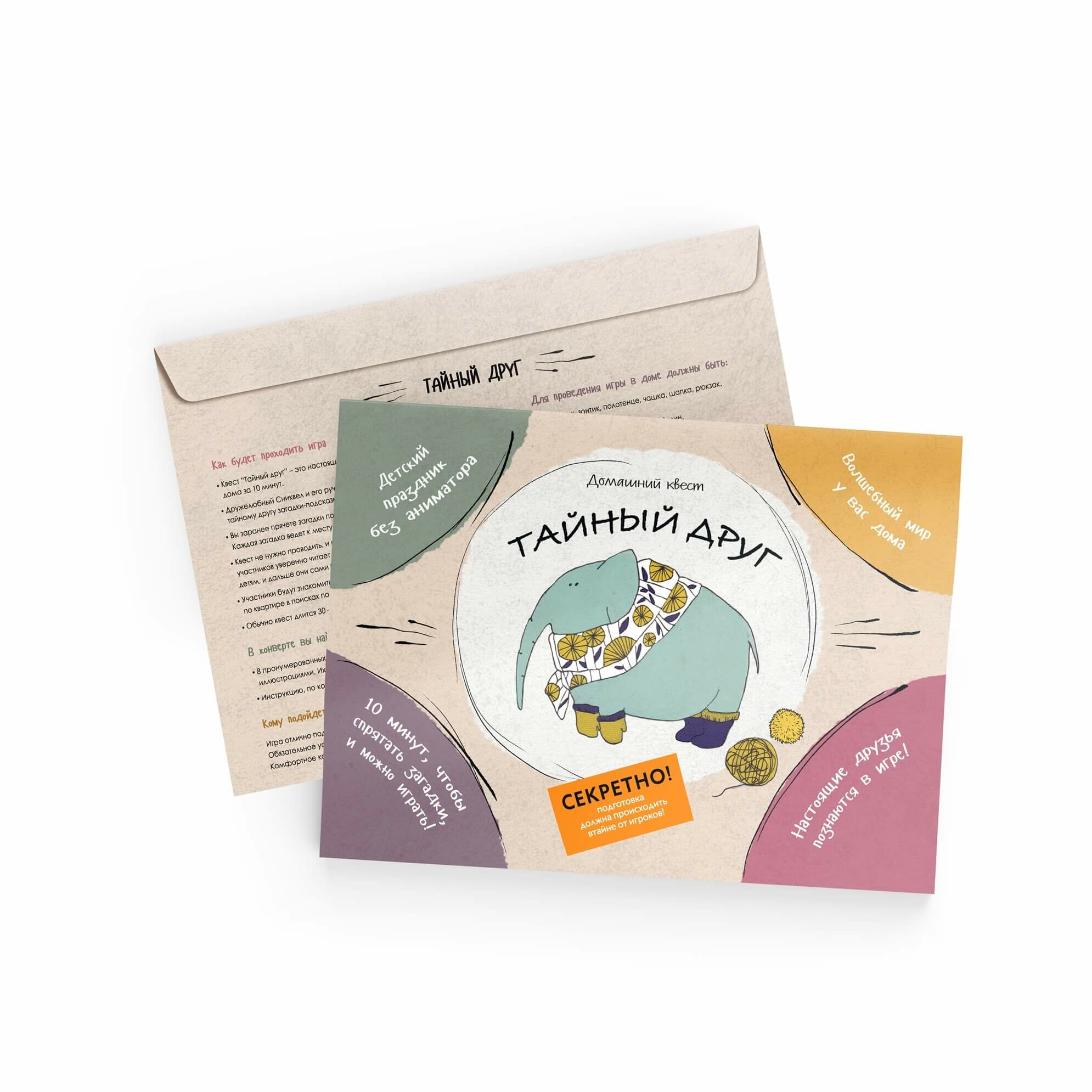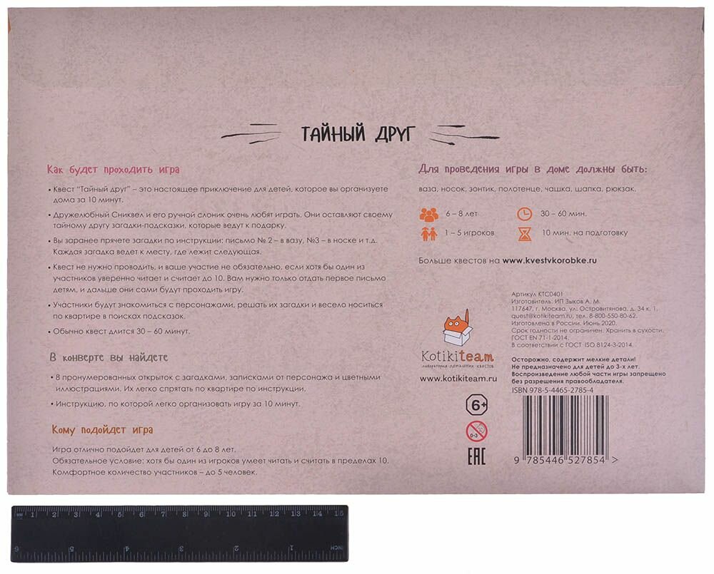 Kotikiteam Квест Тайный друг Уютный домашний квест для детей. Этот квест легко устроить дома, в гостях или на даче. – Время на подготовку: 10 минут; – Длительность игры: 30–60 минут; – Количество игроков: 1-5; – Квест для детей 6, 7 и 8 лет. Детям разного возраста будет интересно играть вместе; – Помощь взрослого не обязательна, если хотя бы один из игроков уверенно читает и считает. Если у детей возникнут затруднения, вы всегда можете им подсказать - все ответы вы найдете в инструкции для родителей. Маленький дружелюбный человечек Сниквел и его ручной слоник очень любят играть. Они прилетели к вам домой с одной целью – поиграть в весёлую игру «Тайный друг». Сниквел и слоник оставляют своему тайному другу подарок, а чтобы было веселее, прячут его в укромном месте в квартире. Загадки-подсказки помогут его найти. В наборе с квестом уже есть все необходимое - листы с загадками, записки, подсказки и иллюстрации. Подготовьте небольшой подарок для детей в качестве приза в конце игры. Перед игрой разложите записки и призы в квартире, отдайте детям первое письмо и приключение начнётся! Вы можете проводить этот квест дома или даче. Игру можно взять с собой в гости или открыть уютным семейным вечером. Пройти квест - гораздо интереснее, чем в очередной раз сыграть в настольную игру. Устройте детям волшебное приключение! В создании квестов Kotikiteam принимают участие сказочники, мастера игр, аниматоры и детские психологи. Наши игры радуют, развлекают, развивают логику, наблюдательность, расширяют кругозор и учат работать в команде! Мы получаем огромное количество благодарностей и восторженных отзывов, дети долго вспоминают об игре и хотят продолжения! У нас много разных замечательных квестов, вы обязательно найдете, во что сыграть и в следующий раз. Наши квесты можно проходить любом порядке. Желаем отличной игры!
