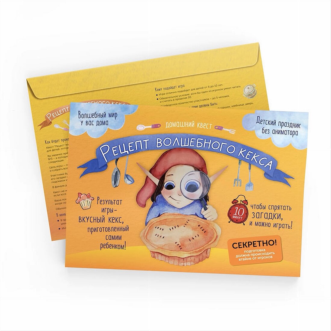 Kotikiteam Квест Рецепт волшебного кекса Маленький дружелюбный человечек Сниквел очень любит играть. На этот раз придется не только разгадывать загадки и искать ингредиенты, но и приготовить вкусный кекс. Вы получите конверт с записками, цветными иллюстрациями и подробной инструкцией для организации игры. Вам нужно будет разложить записки по квартире, следуя нашей инструкции. А в конце помочь ребенку приготовить кекс Для успешного решения загадок участникам нужно уметь читать и считать в пределах 15, или потребуется помощь взрослых. Для проведения игры в квартире должны быть: чашка, холодильник, сахарница, цветочный горшок, хлебница, дверь, стул и место, где хранятся столовые приборы. Вы можете проводить этот квест на даче или в гостях, если там есть все перечисленные предметы. А для приготовления 1 порции выпечки понадобятся следующие ингредиенты: Яйцо — 1 шт. Сахар — 2 ст. л. Мука — 4 ст. л. Молоко — 4 ст. л. Растительное масло — 2 ст. л. Какао — 2 ст. л. Разрыхлитель — щепотка. А также посуда и духовка или микроволновая печь. Веселого аппетита!
