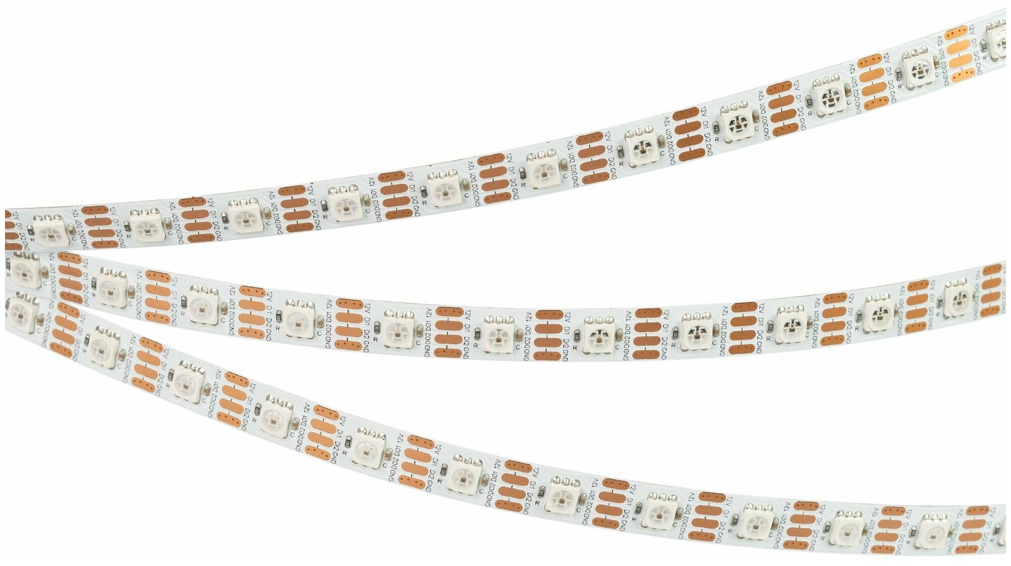 Светодиодная лента SPI-B60, открытая IP20, с драйвером TX1818(cовместимый c микросхемами TM1812, UCS1903, SM16703, WS2811–2815, управляемыми по стандартному протоколу SPI). Светодиоды 5060, 60 шт/м (1 pixel = 1 LED), белая плата 10 мм, скотч 3М. Цвет RGB, угол 120°. Питание 12 В, мощность 9.3 Вт/м (46.5 Вт на 5 м). Размеры 5000x10x1.6 мм. Мин. отрезок 16.66 мм, 1 светодиод. Цена за 1 м.