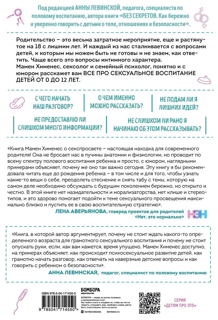 "Книга Мамен Хименес о секспросвете - настоящая находка для современного родителя! Она не бросает нас в пучины анатомии и физиологии, но проводит по всему спектру полового воспитания ребенка и просто, с юмором, наглядными примерами объясняет, почему же оно так важно сегодня. Эту книгу я бы рекомендовала читать еще до рождения ребенка - в том числе и для того, чтобы узнать какие-то вещи о себе, преодолеть стеснение и снять с табу с темы, которую на самом деле необходимо обсуждать с будущим поколениями бережно, но открыто и честно. В этой книге нет назидательности и морализаторства, нет клише и стереотипов, и это здорово помогает подойти к теме сексуального просвещения максимально близко и пустить ее в свою воспитательную стратегию". - Лена Аверьянова, главред проектов для родителей "Нет, это нормально"