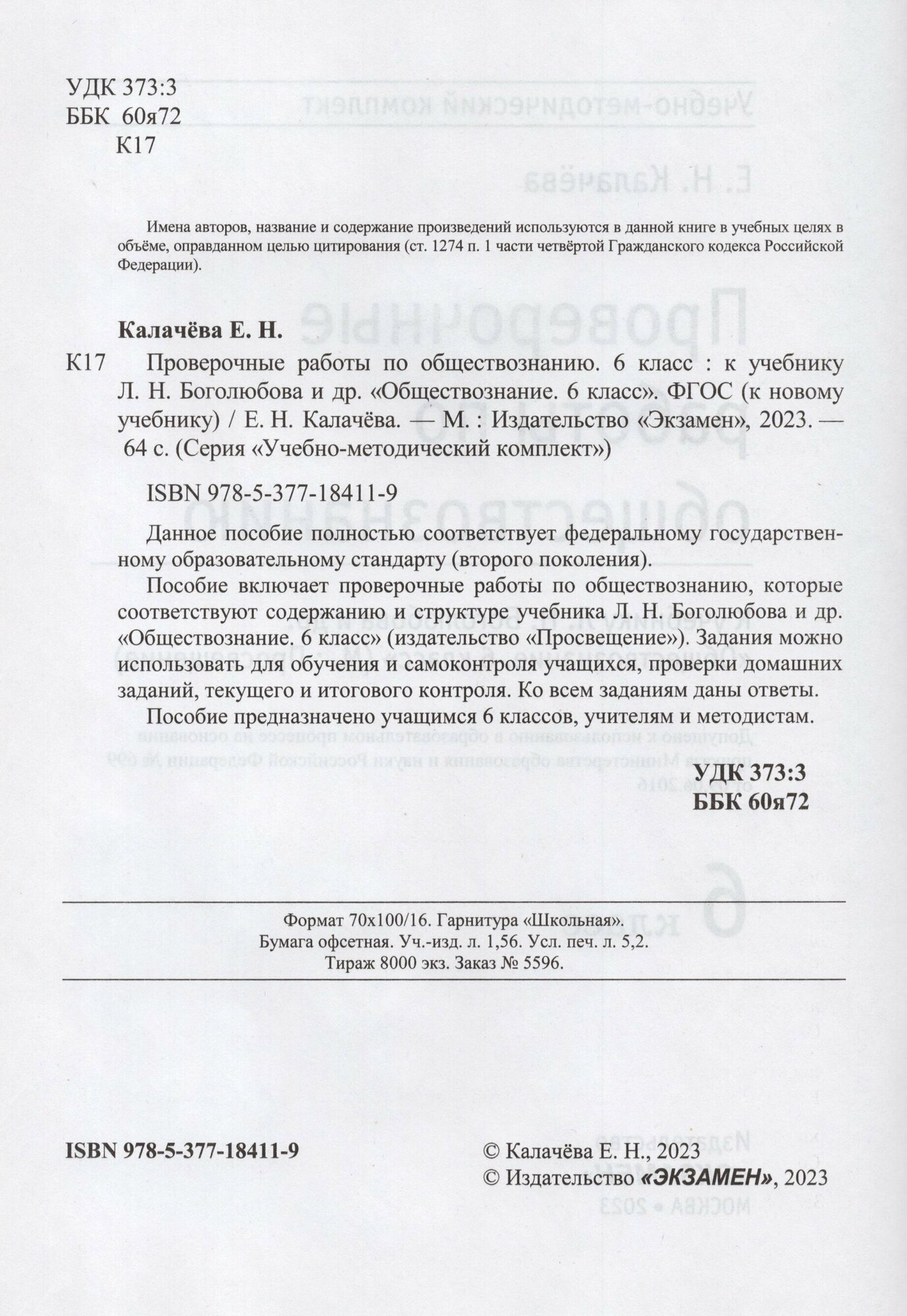 Обществознание. 6 класс. Проверочные работы к учебнику Л. Н. Боголюбова и др. (Калачева Елена Николаевна); Экзамен, 2023