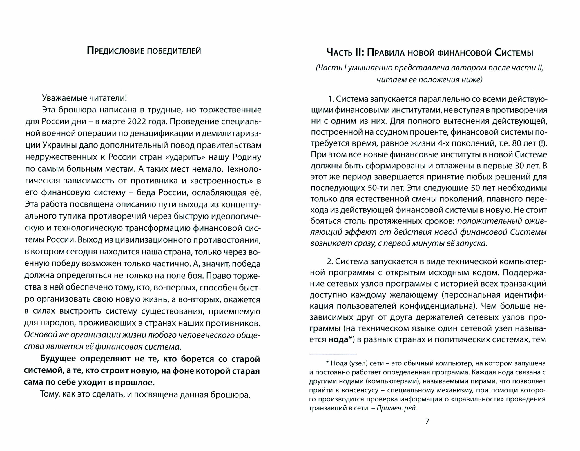 «Центробанку необходимо определить новые параметры функционирования российской финансовой системы». Об этом заявила глава регулятора Эльвира Набиуллина, добавив: «ЦБ предстоит выработать подходы к рекапитализации банков и борьбе с «санкционным арбитражем»». Правительство собирается пересмотреть подходы к регулированию так, чтобы, не давая накапливать чрезмерные риски, банки могли продолжать кредитование и поддерживать структурную трансформацию экономики. Справятся ли банки, или нам жизненно необходим ребрендинг финансовой системы? – Об этом рассуждает автор данной брошюры, уверяя: «В XXI-м веке технологически переход права эмиссии законных денежных знаков в руки граждан возможен уже сегодня. И именно это станет самым главным смыслом начатых крупных и сложных процессов. Государства при этом не исчезнут. Поэтому то правительство, которое первым это поймёт и реализует в своей стране, и предложит народам своих противников, победит! И выиграют от этого сами народы…» В чем автор прав, а в чем он ошибается, автор предлагает разобраться своим читателям