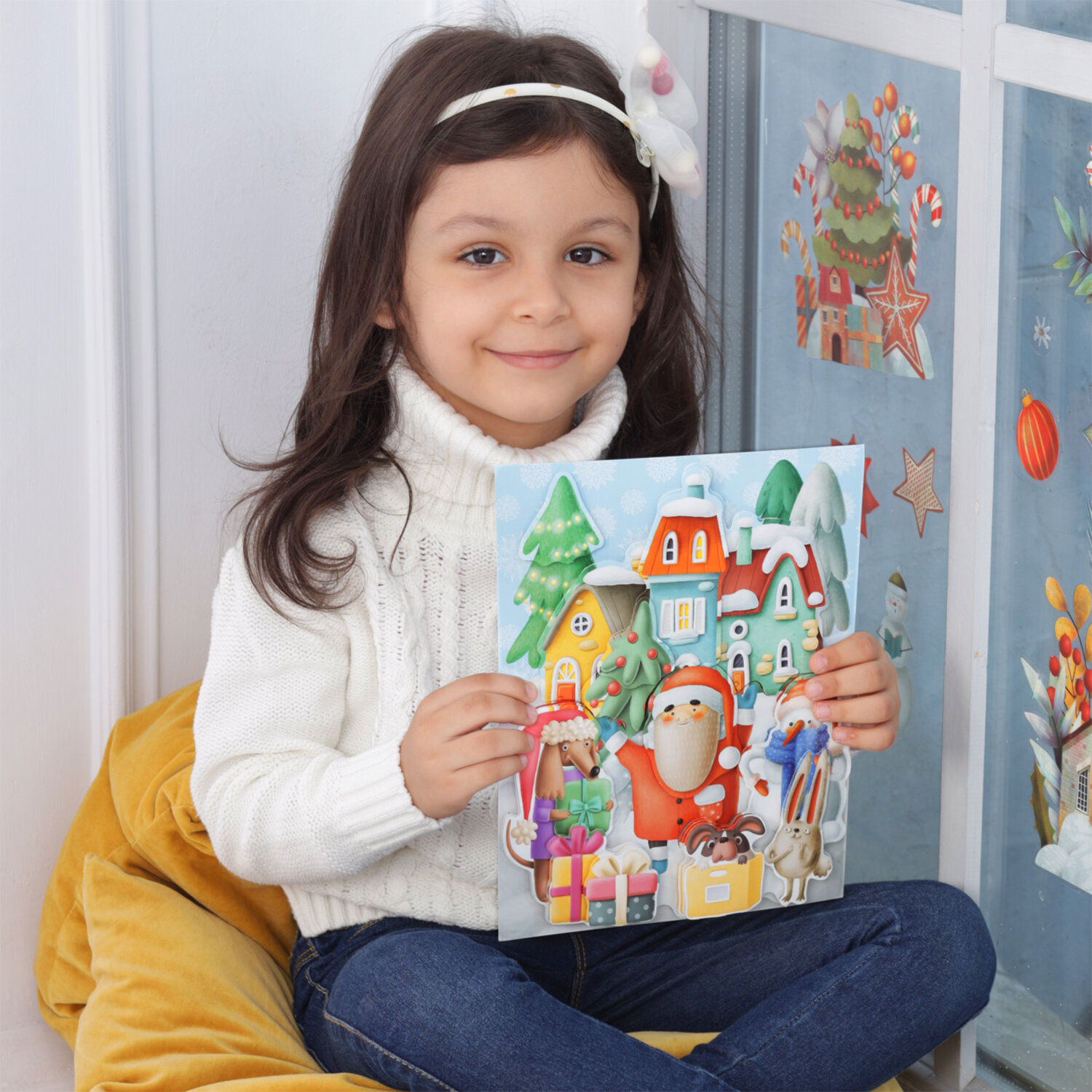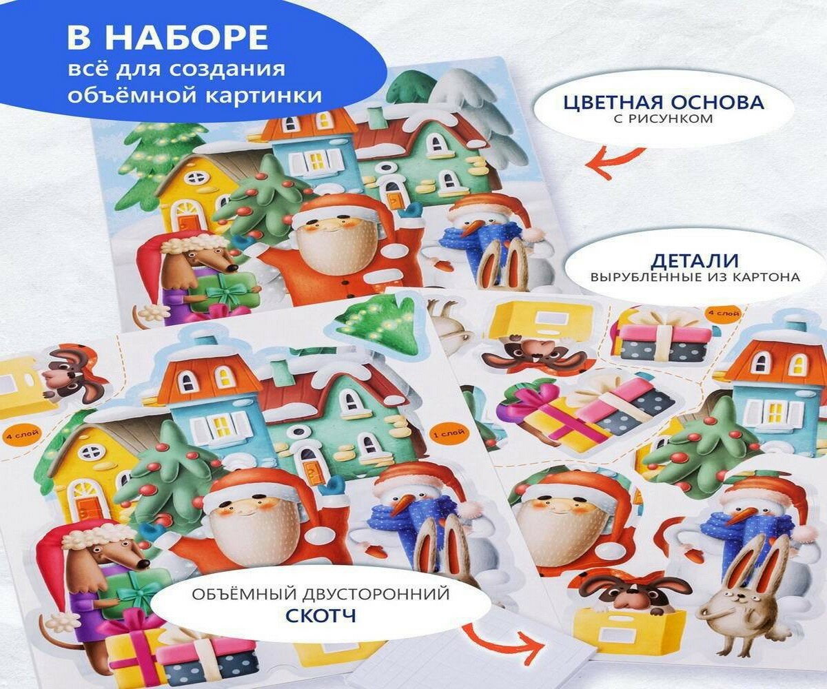 Для создания новогодней 3D-картинки не нужны клей и ножницы - детали уже вырублены, достаточно аккуратно выдавить их из основы, и приклеить на картинку объёмным двухсторонним скотчем. Изображения домиков, подарков и новогодних украшений наклеиваются в несколько слоёв, что придаёт плоскому изображению эффект объёма. Ребёнок легко сделает такую 3D-картинку самостоятельно.