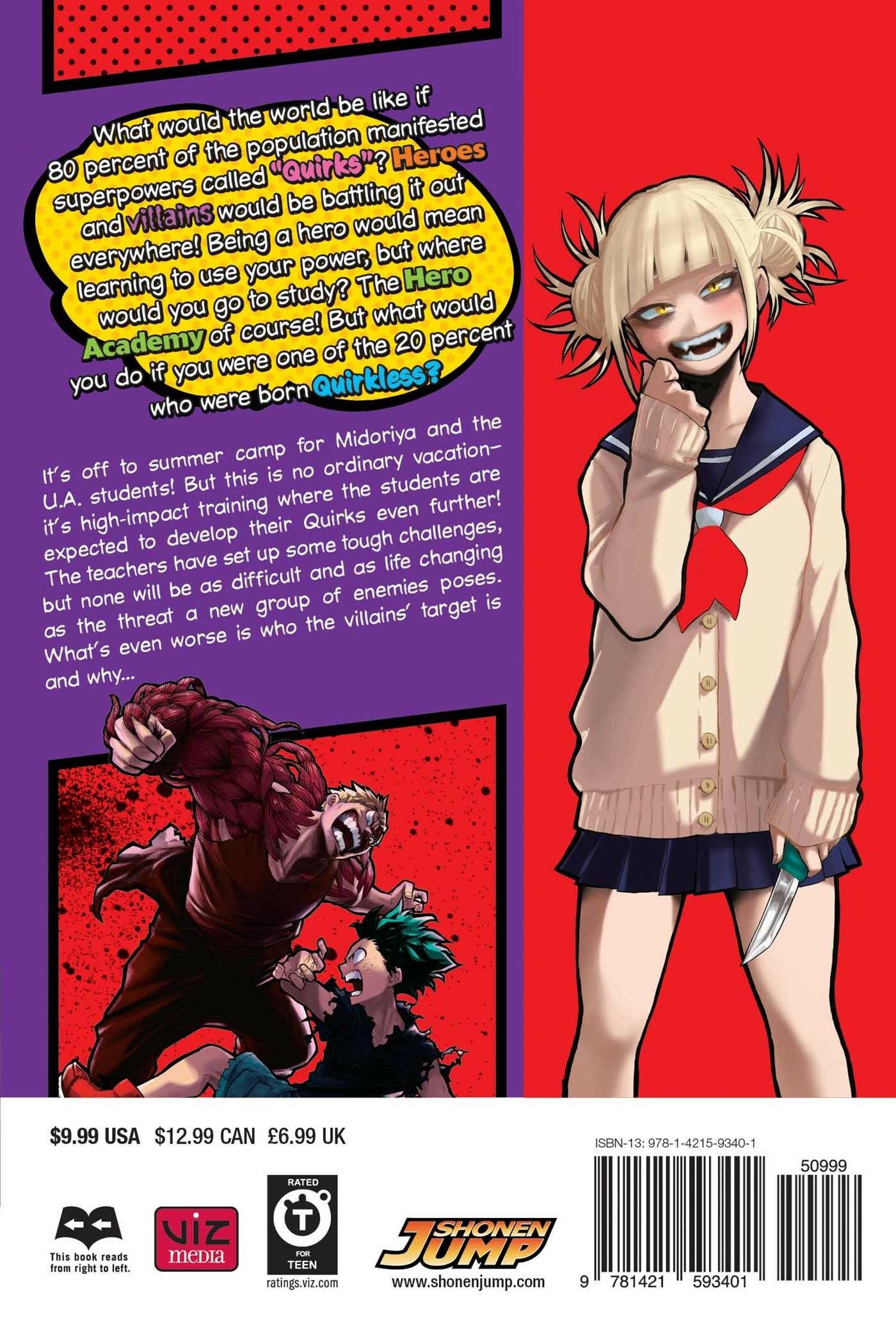 What would the world be like if 80 percent of the population manifested superpowers called "Quirks"? Heroes and villains would be battling it out everywhere! Being a hero would mean learning to use your power, but where would you go to study? The Hero Academy of course! But what would you do if you were one of the 20 percent who were born Quirkless? It's off to summer camp for Midoriya and the U.A. students! But this is no ordinary vacation-it's high-impact training where the students are expected to develop their Quirks even further! The teachers have set up some tough challenges, but none will be as difficult and as life changing as the threat a new group of enemies poses. What's even worse is who the villains' target is and why...