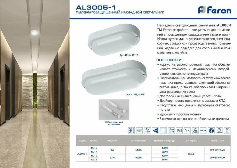 Светильник накладной светодиодный, пылевлагозащищённый (ДПБ) FERON AL3005-1, 8W, 4000К (белый), 220-240V, 640Lm, IP65, угол рассеивания 120°, цвет белый, корпус пластик, рассеиватель пластик, 160*90*46