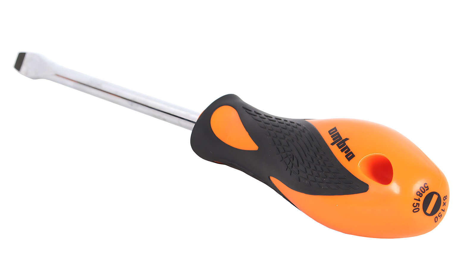 Отвертка BASIC SL8х150 мм с намагниченным наконечникомОтвёртка Ombra Basic пример того, как простой инструмент для работы с внутренним профилем может стать эталоном дизайна. Но помимо шикарной внешности у отвёртки отличные рабочие характеристики. Яркий насыщенный апельсиновый цвет радует глаз и даже заражает оптимизмом. Очень удачное цветовое решение. Такую отвёртку легко будет найти в инструментальном ящике или на заваленном верстаке.В таком ярком цвете есть, пожалуй, лишь один минус. Все отвёртки серии Basic, вне зависимости от профиля наконечника, окрашены в фирменный оранжевый. Поэтому цветовому кодированию, когда цвет рукоятки подсказывает, какой профиль у отвёртки, здесь не осталось места.Основной материал рукоятки — жесткий пластик.На который нанесен черный антифрикционный протектор из резины.Протектор кроме утилитарной функции противоскольжения служит и элементом дизайна, так как выполнен в форме крыльев.В хвосте рукоятки отверстие для подвешивания отвёртки на стену или инструментальный стенд.В передней части рукоятки черная накладка полностью закрывает пластик. Это и уменьшает нагрузку на пальцы, за счет амортизации, и увеличивает прилагаемое усилие — за счет уменьшения скольжения руки.Внимательное изучение рукоятки под углом позволило выяснить еще один нюанс. Передняя часть немного повёрнута по оси относительно центральной части — вершины треугольников в основании этих частей не лежат в одной плоскости. С точки зрения удобства пользователя это безусловно полезное техническое решение.
