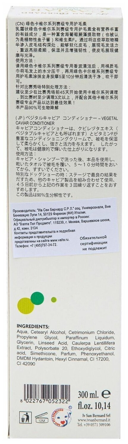 Бальзам-кондиционер Iv San Bernard Green Caviar - это крем-кондиционер богатый экстрактом морской водоросли Каулерпы (известной, как «зеленая икра») и витамином F. Такая комбинация компонентов смягчает и увлажняет шерстный покров, а также придает ему прочность и жизненную силу. Таким образом, шерсть приобретает здоровый и сияющий вид.