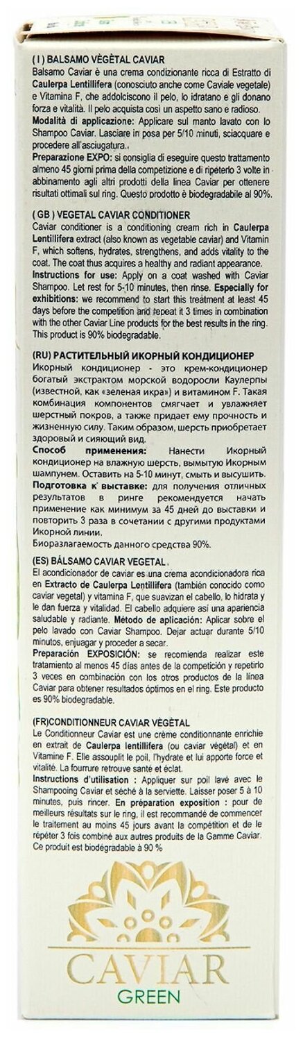 Бальзам-кондиционер — это крем-кондиционер богатый экстрактом морской водоросли Каулерпы (известной, как «зеленая икра») и витамином F. Такая комбинация компонентов смягчает и увлажняет шерстный покров, а также придает ему прочность и жизненную силу. Таким образом, шерсть приобретает здоровый и сияющий вид.