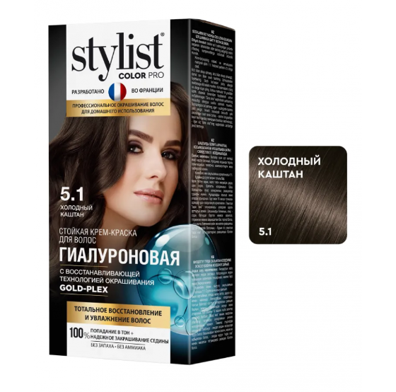 Stylist Color Pro- первая профессиональная стойкая крем-краска для домашнего использования, с рекордным содержанием гиалуроновой кислоты и восстанавливающей технологией окрашивания GOLD-PLEX! Рецептура краски разработана во Франции специалистами в области колористики по самым последним европейским стандартам качества, которая обеспечивает безопасное окрашивание, насыщенный яркий цвет. Максимальная концентрация гиалуроновой кислоты увлажняет, уплотняет и защищает волосы и кожу головы от пересушивания в процессе окрашивания. Активный реконструирующий комплекс GOLD-PLEX, обволакивая каждый волосок, восстанавливает структуру, надежно запечатывает красящие пигменты в структуре волос, продлевая стойкость цвета, миллион золотых частиц усиливают блеск, придают многогранный сияющий перелив оттенка.