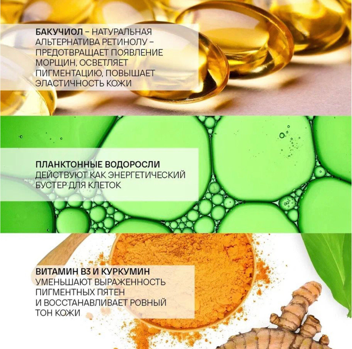 | Активный ингредиент | экстракт меда, бакучиол, планктонные водоросли, ниацинамид (витамин B3), куркумин, масло авокадо, пантенол, токоферола ацетат, коллаген гидролизированный, эластин гидролизированный, масло оливы, лимонная кислота |