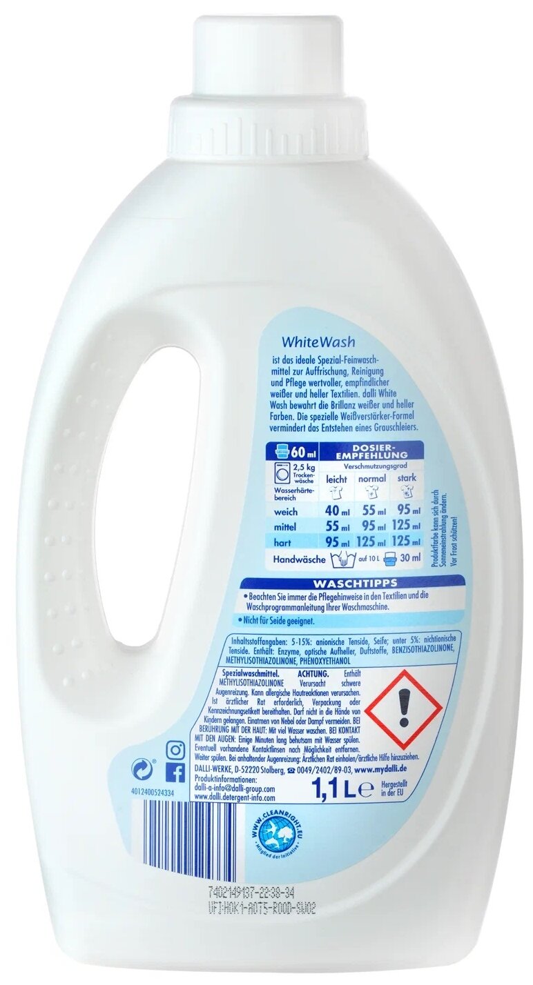 Универсальное средство для стирки белого белья Далли Вайт Вош при температуре 20-60 С. Гель Dalli White Wash сохраняет белизну ткани, не содержит фосфатов, не требует дополнительных средств от извести. Оригинальная немецкая рецептура. Не рекомендовано для шерсти и шёлка.