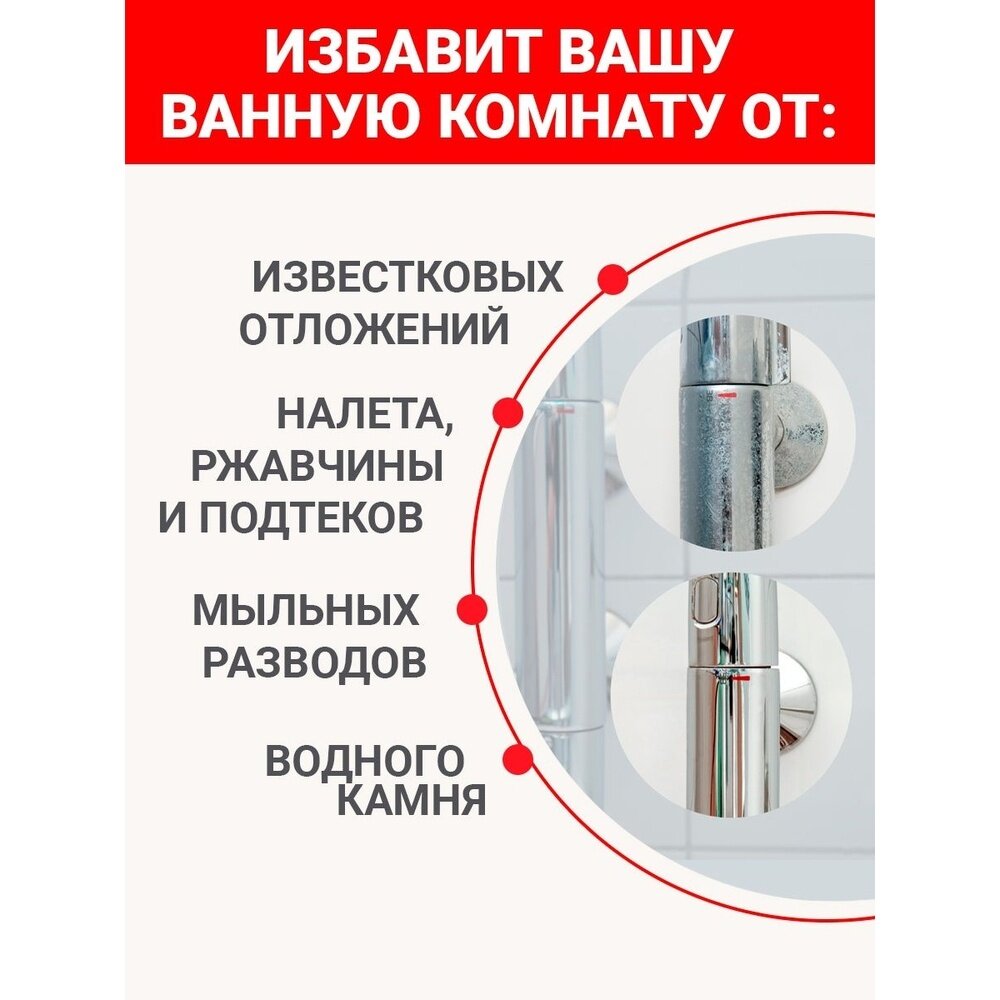 Высокоэффективное пенное средство для основательного и быстрого очищения от известковых отложений, налета, ржавчины и подтеков, мыльных разводов, водного камня и др. За 2 минуты нейтрализует загрязнения, образующиеся на смесителях , кранах, душевых дверцах, кафельной плитки. Подходит для очищения хромированных поверхностей, нержавеющей стали, латуни, меди, бронзы, керамики, пластика, стекла.