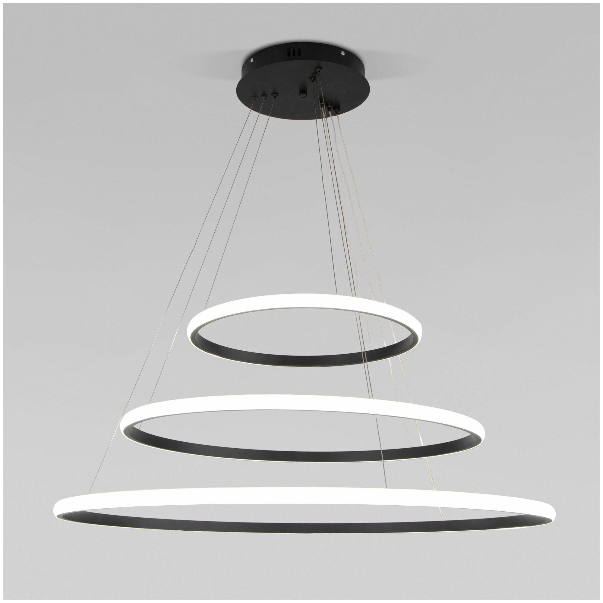 Подвесной LED светильник Eurosvet 90264/3 Collars черный, с пультом управления и с регулировкой яркости поможет создать качественное освещение на площади 28 м. кв. и дополнить современный интерьер. Светильник выполнен из металла, устойчивого к механическим повреждениям и истиранию. Источник света - встроенные энергоэффективные и ультраяркие SMD – светодиоды мощностью 155 Вт, создающие световой поток 11500 лм. Благодаря нестандартной конструкции светильника, создается впечатление, будто он парит под потолком. Светильник комплектуется эргономичным пультом дистанционного управления, с помощью которого можно изменять яркость и цветовую температуру, доступную в трех значениях: 3300, 4200 и 6500 К. Подвесной светодиодный светильник подходит для установки на любые поверхности, в том числе подходит для натяжных и подвесных потолков. Возможность регулировки яркости и температуры, а также функция регулировки высоты (мин. – 53 см; макс. – 135 см.), настройка индивидуального расположения колец и угла наклона, позволят каждому создать абсолютно персональный дизайн светильника и завершить создание идеального интерьерного освещения. Серия Collars – это оригинальные светильники в актуальном стиле минимализм. Максимальная простота конструкции делает серию Collars универсальным вариантом для домашнего, офисного или общественного интерьера практически в любом стиле. Данная серия светильников представлена в белом и черном цвете с 1, 2 и 3 кольцами. Гарантийный срок от производителя – 60 мес.