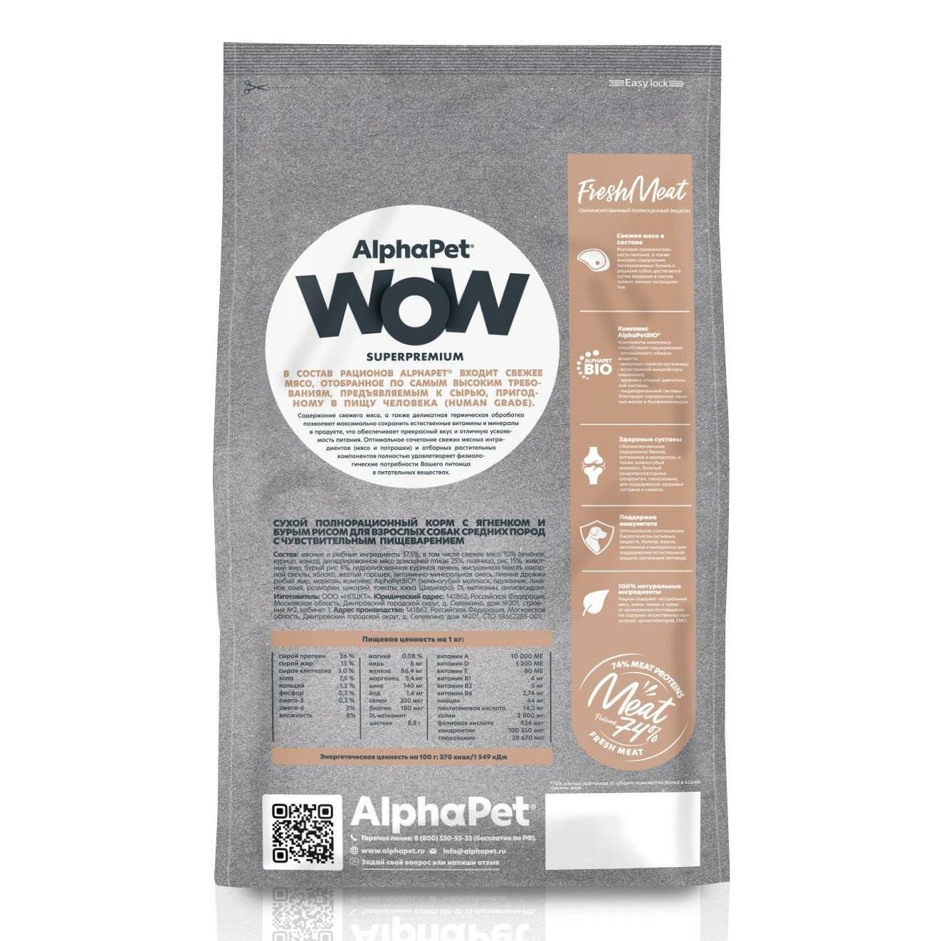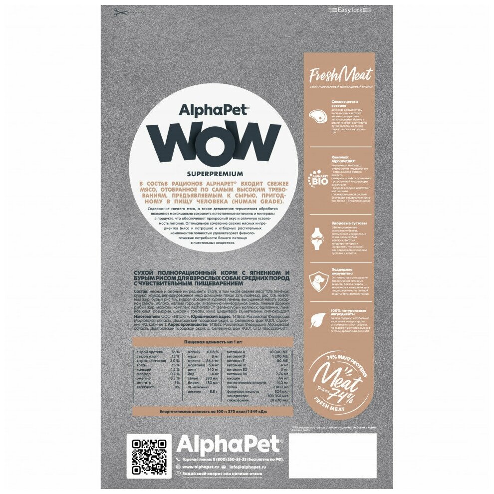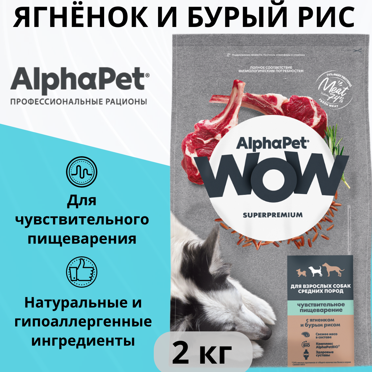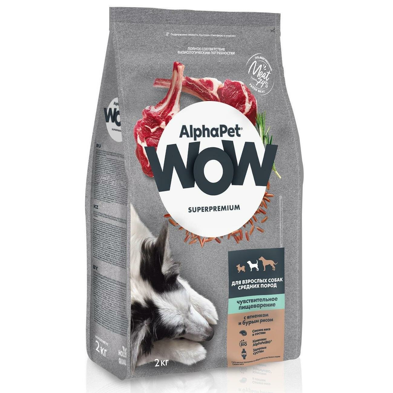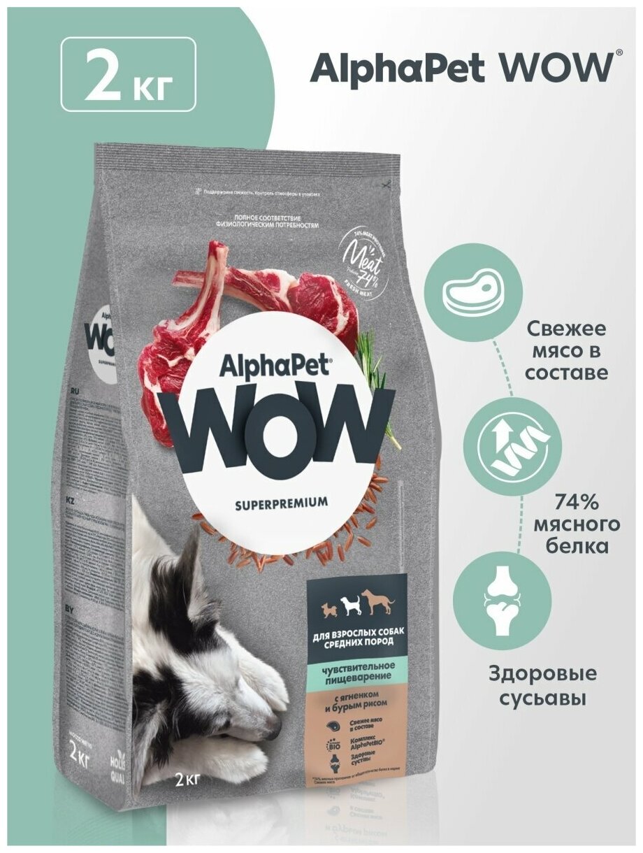 AlphaPet WOW Superpremium сухой корм для взрослых собак средних пород с чувствительным пищеварением (Ягненок и рис 2 кг.)