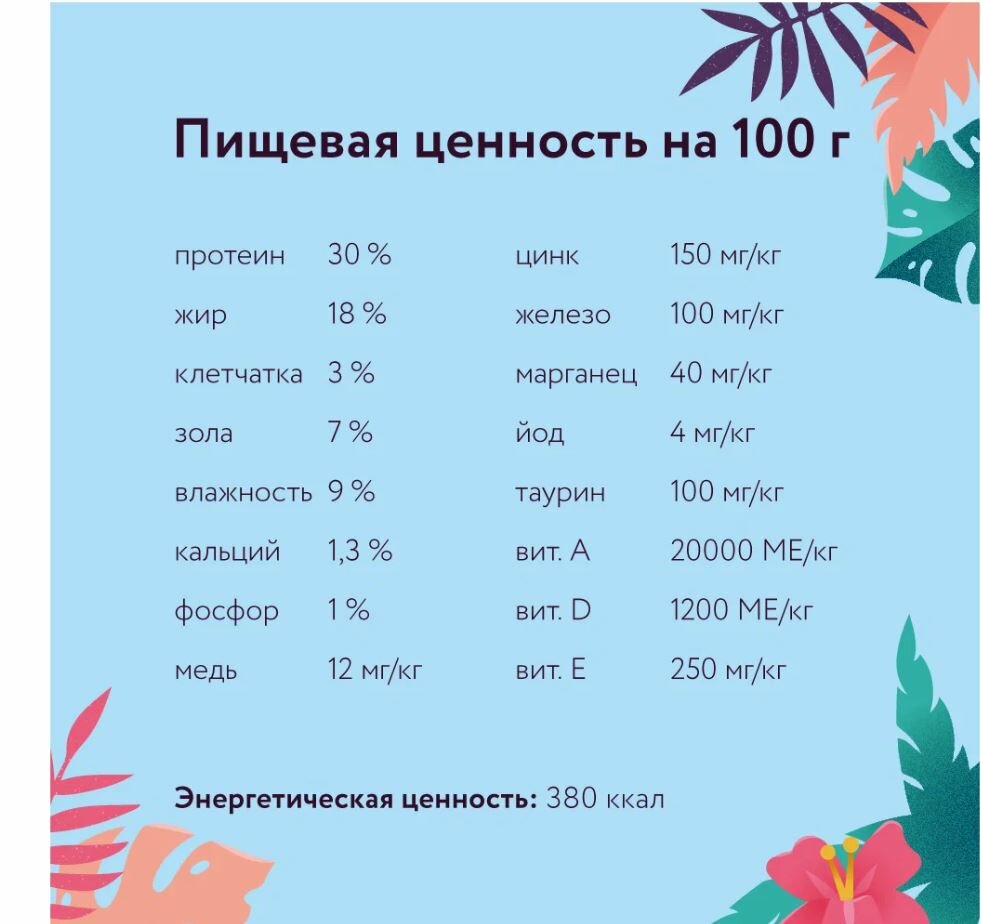 Дегидрированное мясо курицы 28%, рис, маис, куриный жир, гидролизованная куриная печень 5%, отруби, масло лососевых пород, минеральные вещества,